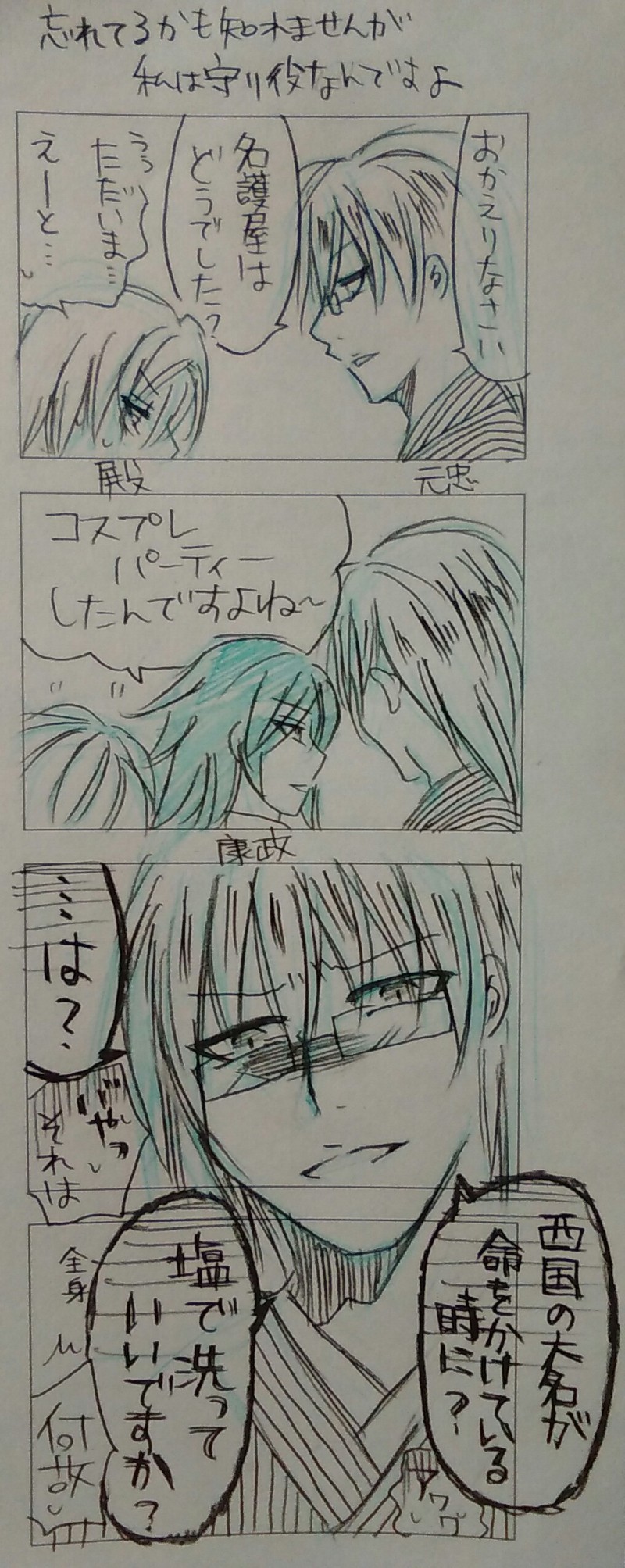 名護屋から帰ってきた殿と、彦とみんな。コスプレ怒られるやつ(雑)