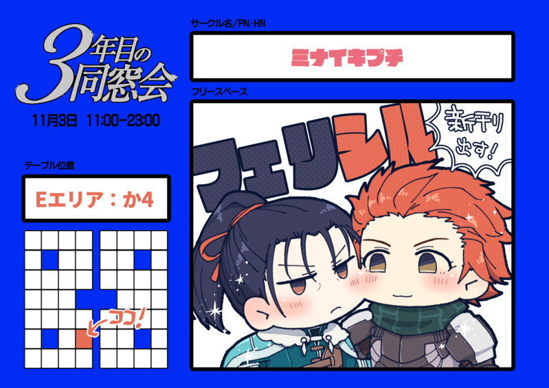 regia000☆quiet followDOODLE11/3 風花webオンリー「3年目の同窓会」フェリシルで参加します~ ##告知 show all(+2 images) Tap to full screen (size:2048x1448).Repost is prohibited Let's send reactions! freqpopularsnackothersPayment processing Replies from the creator Follow creator you care about!☆quiet follow regia000PROGRESSデス原稿 4 regia000PROGRESS表紙絵だいたい完成マスク差分もあるぜ デザインはデザイン屋さんにおねがいしたい~~… 9 regia000INFOシャアシャリ無配のポイピク(あとがき付き)版だぜ装丁の話も追加であるっす新刊『春を忘るな』を読む予定ある人は読了後の閲覧を推奨です通販:https://ec.toranoana.jp/joshi_r/ec/item/040031262637/ 10 regia000DOODLE進捗 11 regia000PROGRESS8月の表紙進捗 5 regia000DOODLE2025/6/8 シャアシャリ新刊:https://ec.toranoana.jp/joshi_r/ec/item/040031245224本日のペーパー漫画です 4 recommended works 茶くれ🍵INFO #やわ大おしながき 年の暮れになると忘れてしまいそうなので早めに投稿させていただきます。 #やわらか大作戦 様の詳細につきましてはこちら(https://yawarakakantai.wixsite.com/sapporo-tokkan/5)をご覧ください。 noboruINFO【通販のお知らせ】先日公開した漫画が同人誌になります!ご注文は以下の二ヶ所で受け付けております(匿名配送のみ)BOOTHさん: https://grgrko-ro.booth.pm/items/1798103PictSPACEさん: https://pictspace.net/grgrkoroよろしくお願いいたします~! 6 regia000INFO #エアブー超GWスペシャル お疲れ様でした ペーパーです() 読みづらいので黒バージョンも 2 73302DONE告知用に用意した画像です。この背景を急に脳内ストレージから取り出したら表紙を差し替えろとかひと悶着して大変だったのは秘密(2020/06/07追記)本文様の側が希望者購入制になったのでURLを載せていいよ! という話になったわよ…… 興味があったらどうぞhttps://pimo-pimosyoi.booth.pm/items/2133340 2 mikopoiragiINFO掲載日が近づいてきたので、セルフ宣伝します。新作漫画が「ジャンプ+」にて6月3日に掲載されます。なにか大きなミスがない限り載るはず…です。少しでも興味があったらwebでも読めるので、読んで貰えたらとってもうれしいです。 mikopoiragiINFOコメディ調大真面目マンガ「ゲートキーパー‐失恋編‐」、ジャンプ+にて読切掲載中です。たくさんの人に読んで貰えたらとってもうれしいです。ひと仕事終えたので、なにか栄養のある、温かい物を食べようと思います。これからも、またお目にかかれるようがんばりますね! regia000DOODLE regia000DOODLE幻覚ー!!! noboruINFO11月インテのクレガロオンリー申し込みました!このカットは仮絵なので差し替え予定ですが、新刊出せるように準備がんばります~!