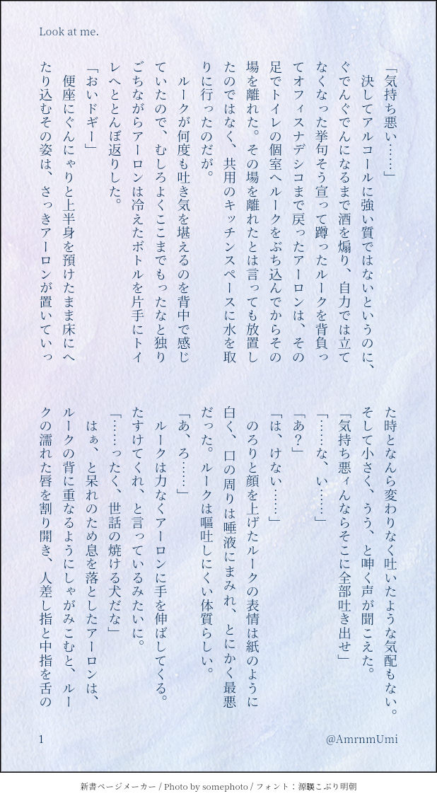 AmrnmUmi☆quiet followDONE嘔吐ネタ。くっつく前、まだdiscardを追っている初期アロルク…のつもりです。 ##バディミ #初期アロルク initialArolc. show all(+3 images) Tap to full screen (size:618x1132).Repost is prohibited Let's send reactions! freqpopularsnackothersPayment processing Replies from the creator Follow creator you care about!☆quiet follow AmrnmUmiDOODLE夏の光バ。汗をかくルにムラッとしてしまうアの話。 2 AmrnmUmiDOODLE初夜失敗!!!!!!なぜか最後ちいかわエンドになっちゃった…(書いてる途中で力つきたから…)🔑ア誕 5 AmrnmUmiDOODLEカーディガンが流行ってると聞いて書いたアロルク。ウブいアロルクが大好きだ…… 3 AmrnmUmiDONE夏にバーベキューしてたら流れでそういう雰囲気になったアロルク。汗だくでえっちしてほしくて…突発SS 4 AmrnmUmiPAST2023年9月に出した合同誌『Second』のプロット(というかほぼメモ)一応ワンクッションつけときます 2 AmrnmUmiDONEある雪の日の話 アロルク4p+おまけアロ視点2pの短編です! 6 related works みおつきDOODLE現行&初期アロルク ちゅー絵の練習な落書き 1hF4nlDOODLE初期アロルクの捏造妄想バディ結成時漫画です公式の爆弾でうわー!ってなって描き始めたんですけど、途中で何を描いているんだ私は…と正気に戻ってしまったのもあって色々とふわっふわです 4 little333littleSPOILER初期アロルク (本編ネタバレあり) mzzzkkkDONE『闇を駆ける』ワンドロ投稿作品です。相方の武器を使うのはロマンです!!!!一応初期アロルクの設定で書いてます。(あんまりそれ感無いですが) 5 kimadosukoiSPOILER双子パロ③ネタバレ注意! 2 あらおSPOILERキャプションで主にネタバレギスギス期 〜腕折られたりレイプまがい(真)なことが起こったりする。犯罪者と警察の距離感そこに一石を投じられることで始まる相棒関係。アロは初恋こじらせ済み。↓探り探り期 〜アロの破壊活動の事情がやそのせいで荒んだりしてるところを見る。からの、アロの状況をなんとかしてやりたい感情が生まれ、積もり、ポロリ。気付き。↓お前きみオレの僕のこと好きなのか!?ワーッ! AmrnmUmiMOURNING初期アロルク友人と吸血鬼パロについて盛り上がったのでアロルクに置き換えてみた。ルーク:生まれつき吸血鬼。長いこと生きてるので暇つぶしのノリで国家警察に所属してる。アーロン:人間。大怪盗ビースト。壊し屋の異名を持つ。(ほぼまんま)二人はライバル的な関係みたいな感じ深く考えずに書いたので深く考えずに読んでください……! 3 あらおSPOILERツイッターで垂れ流したオメガバースな初期アロルクの小ネタ。後で修正なり追加するなりしたいお急ぎクオリティ…。ふんいきでお察しください。ややすけべ描写あるます 3 kimadosukoiDONE※ニンドリ7月号ネタバレ※幻覚ましまし初期アロルクもぉーーーーーーーー!!!あんなん見たら描くしかないじゃん!!!!! 2 recommended works 翠茄(suica)PAST”イタコマンガ家鬼滅まつり”のタグのやつ。蟲恋スピードスターは別途うpしてあるので割愛。 HidukiDOODLEラビュル生で第五人格パロ落書き kimadosukoiSPOILER大遅刻の猫耳アロルク漫画の続き一コマだけ子アロ入ってるので、念のためネタバレ防止してます 2 ざくろDONEワンドロお題「桜」咲き誇る花よりも鮮やかな BoxharkDONE31DAYS 3/26 For Aw 3 shomeru_bondDONE先端恐怖症ぽいトラウマをもってしまったルーク君という妄想M2イベント楽しませて頂いてます。※ほぼアロルク 5 AmrnmUmiDONE最初期アロルク(兄弟設定/すでに身体の関係もある)アロ→→→(←←←)ルクみたいな感じです 4 lasihoo_prskDOODLE❄🎼 password : mfy birthday 2 あおいしょうPROGRESS桐生ちゃん、ちょっと目を細めた方が桐生ちゃんに見えるような気がする…?