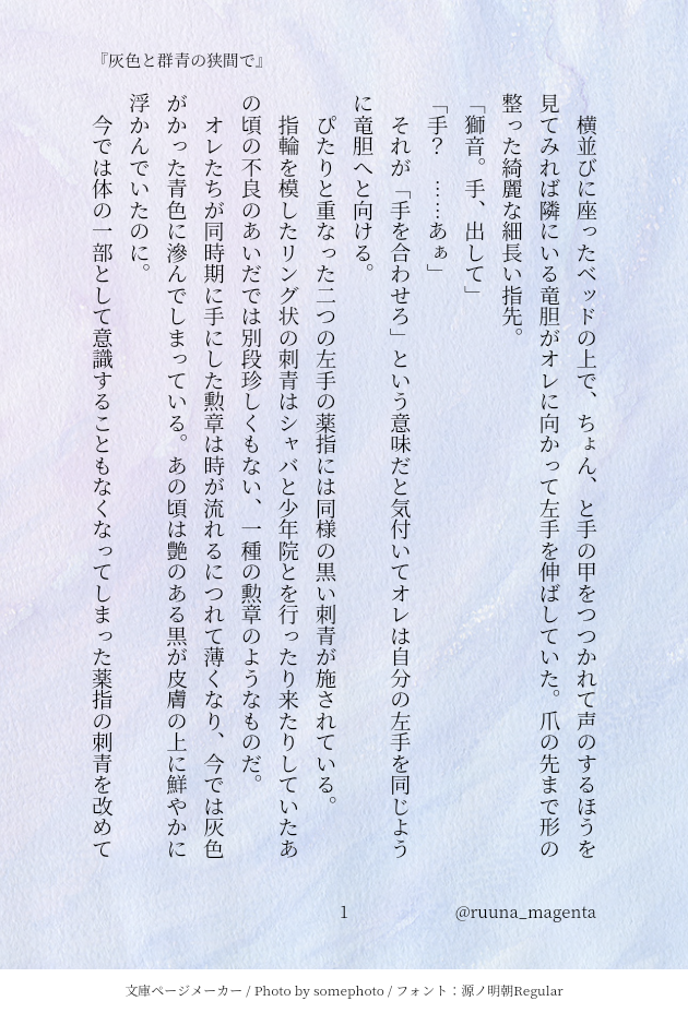 るぅな☆quiet followDONE『灰色と群青の狭間で』(竜獅)梵🔟竜胆×社会人獅音鉄パイプを持って駆けずり回っていたこともあったよね、な二人。二人とも年少リング(刺青です。詳しくはぐぐってください)を入れている設定。 #竜獅 dragonLion show all(+2 images) Tap to full screen (size:630x928).Repost is prohibited Let's send reactions! freqpopularsnackothersPayment processing Replies from the creator Follow creator you care about!☆quiet follow るぅなMOURNING竜獅⚠R-18この前書いた小説の場面絵。ほぼラフ。 2 るぅなDONE『燃やし尽くして飲み込んで』(竜獅)⚠R-18梵🔟りんどう×社会人しおんツイッターで公開した小説(1p〜14p)と加筆部分(15p~31p)です。テレセクとか自慰とかする。様々な性癖に寛容な人向け。※リスインはプロフ読んでから申請お願いします! 32 るぅなMOURNING出す予定のない竜獅本の表紙進捗。下に行くほど完成に近づいているかもしれない。 5 るぅなPROGRESS⚠testラフ、🔞、作業進捗 2 るぅなDONE『レグルス』(イザナ+獅音)以前書いた小説に「腕に根性焼きが入ってるしおんちゃん」という設定のものがあり、そこから派生した話です。3ページ目は吹き出しで隠れてない状態のお部屋です。 3 るぅなPROGRESSかくぃざ漫画の進捗。(星座のやつのかくちゃん側の話) 4 related works るぅなDONE『七竈と愚行』(竜獅)梵天竜胆×社会人獅音ある日偶然数年ぶりに再会を果たした二人。竜胆は自分と獅音の生きている世界の違いに愕然とする。 15 YeDhase2mr1BBfMCAN’T MAKE 757 るぅなDONE『灰色と群青の狭間で』(竜獅)梵🔟竜胆×社会人獅音鉄パイプを持って駆けずり回っていたこともあったよね、な二人。二人とも年少リング(刺青です。詳しくはぐぐってください)を入れている設定。 3 るぅなDONE『雨上がりの愚者たち』(竜獅)梵天竜胆×社会人獅音獅音の部屋で雨が上がるのを待つ竜胆。他愛もない会話をしているうちに竜胆の中で獅音に対する感情が変化していく。※恋愛感情を伴わない蘭←竜とイザ←獅が前提として含まれています。※女性関連の話題がでます。 13 recommended works るぅなDONE『七竈と愚行』(竜獅)梵天竜胆×社会人獅音ある日偶然数年ぶりに再会を果たした二人。竜胆は自分と獅音の生きている世界の違いに愕然とする。 15 るぅなDONE『雨上がりの愚者たち』(竜獅)梵天竜胆×社会人獅音獅音の部屋で雨が上がるのを待つ竜胆。他愛もない会話をしているうちに竜胆の中で獅音に対する感情が変化していく。※恋愛感情を伴わない蘭←竜とイザ←獅が前提として含まれています。※女性関連の話題がでます。 13 るぅなDONE『灰色と群青の狭間で』(竜獅)梵🔟竜胆×社会人獅音鉄パイプを持って駆けずり回っていたこともあったよね、な二人。二人とも年少リング(刺青です。詳しくはぐぐってください)を入れている設定。 3 ケルトン猫DOODLE无极娟,妖精打架 10 4h2k8rTRAINING鶴丸、いつもこの顔してる、安心させてくれる。受け顔の攻めなので人を選ぶよ特大羞恥に苛まれてオノマトペを入れられませんでした。おろかものです しげぞぞDOODLE少しえろいかな 4 FL4TSN4RKMEMOAシエを思い出す曲 101 luzuoziDONE 2 ひゅうが8番街DOODLEショタT(妄想)ショートヘアで真ん中分けやったらかわええやんっていうだけ 2