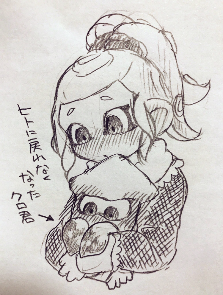 ヒト状態とイカ状態の黒々ちゃん。ヒト状態になれなくなったのか、ヒト状態に戻れなくなったのかは個人の感覚が違いそうな気がする。仕様上デフォルトがヒト状態なので「戻れなく」と書いてます