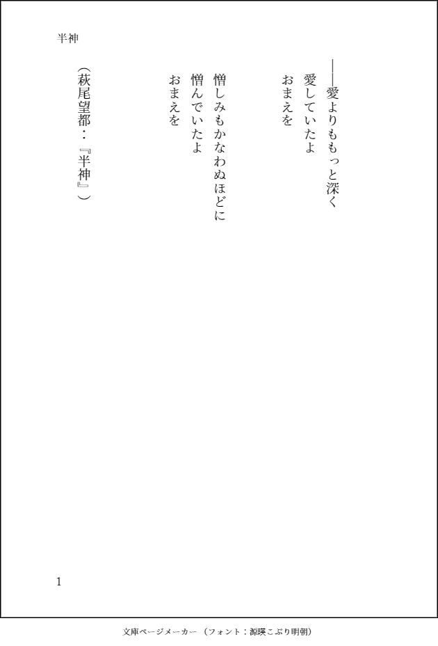 リツ@字書き☆quiet followPROGRESS五夏・夏五・小説。【半神】萩尾望都の有名漫画と同タイトル。独自すぎる解釈で2006年5月から夏油離反までと、その後を書いてます。終わりそうにないので、Twitterに進捗をUP。 #五夏 GoGe #夏五 GeGo #小説 novel show all(+13 images) Tap to full screen (size:630x928).Repost is prohibited Let's send reactions! freqpopularsnackothersPayment processing Replies from the creator Follow creator you care about!☆quiet follow リツ@字書きDONE五夏ワンライ、お題「快感」。高専五夏(R18)。五が不服そうな顔をする事に、快感を得る夏の話。書いていて面白かったので続きが書きたくなりました。 4 リツ@字書きPROGRESS五夏・七夕真ん中バースデー小説!日が経ちましたが、まだ完成しません。途中経過を晒します。【あらすじ】目覚めた夏油は、四百年前の江戸時代初期の世界にいた。そこで、『五条悟』を名乗る(どうみても本人にしか見えない)悟の先祖に出会う。白居易の漢詩「長恨歌」になぞらえた、七夕の悲恋。※注意※悟の先祖であると同時に前世的な扱いで書いておりますが、厳密にいうと「別人」です。 8 リツ@字書きDONE #五夏深夜のワンドロライ一本勝負お題「試練」「涙」(全6枚)。五夏というより、さしすです。試練と聞いて「灰原の死」が真っ先に浮かんでしまいました。暗い上に、自己解釈・設定の捏造を含んでいます。 6 リツ@字書きDONEワンオロお題:「蛸」 「水着」高専時代(2007年6月ごろ:全5枚)【ニライカナイ】…琉球の他界の概念について。ダラダラ喋っている二人が好きです。(なんど挑戦してもBLにならない) #五夏深夜のワンドロライ一本勝負 5 リツ@字書きDONE【五夏】異床同夢2007年9月、任務前日の五と夏。※異床同夢…「同床異夢」の造語。同タイトルの小説有。異なる寝床で寝ていても、同じ夢を見ている。転じて、違う立場にありながら、同じ考え方をする事。 8 リツ@字書きDONE【五夏/灰七】自分じゃ分からない高専時代。寮にて。先輩後輩で性癖について語った結果、それぞれのヤバさが分かった話。(R18付けようかと考えて、止めました) 6 related works uaa*DONE☆逆バニー五夏 スプリットタンでピアスバチバチ逆バニー傑クン、☆生えてきたらいいじゃない五上下悟くん と3P-------------パスワード-----------------18歳以上ですか?( yes / no ) 4 NicoRosyYuDOODLE五夏色色 20 shino_2652DOODLEセ…しないと出られない部屋・基本五夏ですが割と硝傑要素もあります(全員付き合ってない)。女の子攻めが好き。・描きたいところだけ。中途半端に終わります。 6 uaa*DONEねんどろ五夏ちゃん。童貞をコロすセーターお気に入りですwスイーツまとめました 17 はづきDONE五夏♀新刊サンプル (R18含) 6 kaoryu12273PROGRESS3~6月に出すかもしれない話の冒頭です。相変わらず記憶なし×ありの転生。舞台はずっと未来かもしれないこの列島の何処かです。もし一言でもあれば、こちらから!https://wavebox.me/wave/3vwvg0bho3p7xq56/イベント中に増えるかもしれないし、Xで連載をはじめるかもしれません。 2072 rororo_SxGDOODLE貞操帯…五夏… uaa*MOURNING🔞センシテブ緊縛ちみ写真です気をつけて!!指サックちみ五、ちみ乳首相撲写真などなど大丈夫な人だけどうぞ!パスワード18歳以上ですか?( yes / no ) 10 kaoryu12273DONE「もう一度恋をしよう」SSです。