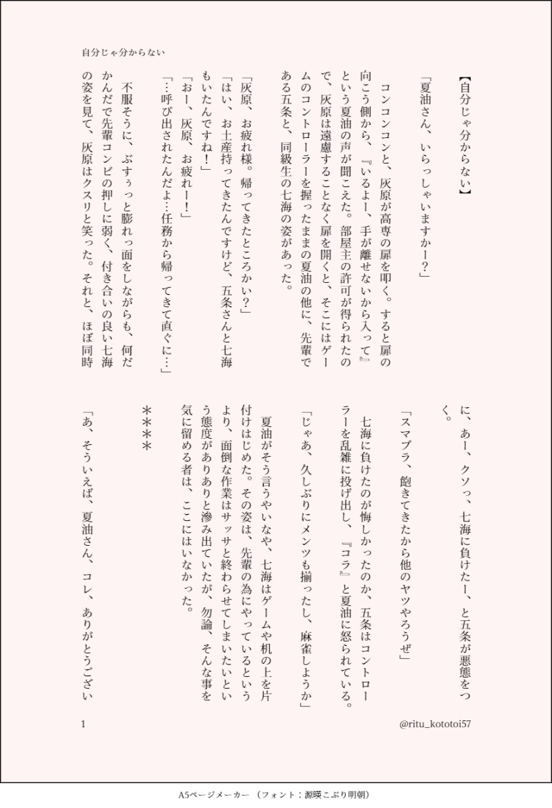 リツ@字書き☆quiet followDONE【五夏/灰七】自分じゃ分からない高専時代。寮にて。先輩後輩で性癖について語った結果、それぞれのヤバさが分かった話。(R18付けようかと考えて、止めました) #五夏 GoGe #灰七 ash7 #小説 novel show all(+5 images) Tap to full screen (size:888x1300).Repost is prohibited Let's send reactions! freqpopularsnackothersPayment processing Replies from the creator Follow creator you care about!☆quiet follow リツ@字書きDONE五夏ワンライ、お題「快感」。高専五夏(R18)。五が不服そうな顔をする事に、快感を得る夏の話。書いていて面白かったので続きが書きたくなりました。 4 リツ@字書きPROGRESS五夏・七夕真ん中バースデー小説!日が経ちましたが、まだ完成しません。途中経過を晒します。【あらすじ】目覚めた夏油は、四百年前の江戸時代初期の世界にいた。そこで、『五条悟』を名乗る(どうみても本人にしか見えない)悟の先祖に出会う。白居易の漢詩「長恨歌」になぞらえた、七夕の悲恋。※注意※悟の先祖であると同時に前世的な扱いで書いておりますが、厳密にいうと「別人」です。 8 リツ@字書きDONE #五夏深夜のワンドロライ一本勝負お題「試練」「涙」(全6枚)。五夏というより、さしすです。試練と聞いて「灰原の死」が真っ先に浮かんでしまいました。暗い上に、自己解釈・設定の捏造を含んでいます。 6 リツ@字書きDONEワンオロお題:「蛸」 「水着」高専時代(2007年6月ごろ:全5枚)【ニライカナイ】…琉球の他界の概念について。ダラダラ喋っている二人が好きです。(なんど挑戦してもBLにならない) #五夏深夜のワンドロライ一本勝負 5 リツ@字書きDONE【五夏】異床同夢2007年9月、任務前日の五と夏。※異床同夢…「同床異夢」の造語。同タイトルの小説有。異なる寝床で寝ていても、同じ夢を見ている。転じて、違う立場にありながら、同じ考え方をする事。 8 リツ@字書きDONE【五夏/灰七】自分じゃ分からない高専時代。寮にて。先輩後輩で性癖について語った結果、それぞれのヤバさが分かった話。(R18付けようかと考えて、止めました) 6 related works airDOODLEねえ七海 chuutadesuDONE🔞 Nanami NSFW Week Day 4 - SoloDon't touch. Just watch. halvmondHappy New Year #灰七 chuutadesuDONE(ENG)🔞Nanami NSFW Week Day 5 - OmegaverseHaibara - ALPHANanami - BETA 3 シラユキDONE⚠️大人灰七バスローブの続き(?)えっちな灰七描いてて楽しい HaniwaDONE✨🥖🕺「はいよろこんで」🕺🍙✨YT: https://www.youtube.com/watch?v=1K3WDpgbKsITWT: https://x.com/HaniwaBun/status/1825095474044629069 えのこDOODLEhttps://twitter.com/enoboooooooooo/status/1652360475777302529?s=20の続き(?)で謎時間を過ごすはいななちゃん ななおDOODLEさっきの続き的なやつ(夏七/灰七/五七) 3 chuutadesuDONE(中)🔞Nanami NSFW Week Day 5 - ABO灰原 - ALPHA七海 - BETA 3 recommended works かほる(輝海)DONEシティーハンター冴羽獠×槇村香原作以上の関係。フォロワーのPegasus☆さま(@Ryo_tatuya_shin)のお題に、許可をもらってコラボさせていただきました。【Pegasus☆の獠と香】「俺じゃ駄目ですか…?」#この台詞から妄想するなら2https://t.co/BLb8NVgFujダンスパートナーで書くならこんな感じ?(*´艸`*) 7 もち世≒百合猫DONE #五夏五夏のワンドロ用。もうお互い別の世界で居る感出したかった。 くろねこDONE同じ言葉言わせたのになんだか違う意味に聞こえてしまう五夏(元ネタは吉〇沙保里さんと佐々〇希さん)#五夏#呪術廻戦 3 tozboDONE【日本語版】祓本24時間SP番組(注意:ほんの少しR18があります…) 7 キツキトウDONE2022/7/7書きもの/「Wisteria」本日二話目の更新。何度確認しても誤字脱字妖怪と闘っている。もし誤字脱字がありましたら生暖かい目で見守っていただけると幸いです……。※創作BL・異類婚姻譚・人外×人・R-18・異種姦・何でも許せる人向け。 31054 キツキトウDONE2023/9/10虚に入る虚。確かに其処にあったのだ。----------お題はなし。欠伸した時(油断してるし)に何か飛び込んで来たら怖いなって。時々作業のお供にする怪談凸を聞きつつ、目を閉じながら欠伸した時にそう思って(情緒が迷子)。欠伸する時は口に手を当てよう!(違うそうじゃない) 183 大葉豆腐DOODLE家入さんちのサトルとスグル※獣化→人間化(耳・しっぽアリ)※ 35 arigatona101DOODLE0721 2 SilliconinDOODLE*龍アソ很仓促粗糙的随笔,阅读顺序右→左关于生与死的相互缅怀 10
