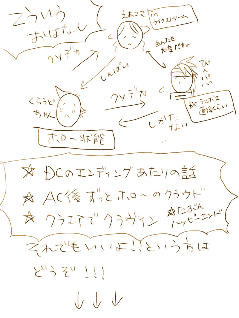 なんごく☆quiet followDOODLEくらうどちゃんの幸せについて考えているうちに何故かこうなってしまった※クラエアでクラヴィンです。大丈夫な方だけどうぞ #FF7 show all(+17 images) Tap to full screen (size:1536x2048).Repost is prohibited Let's send reactions! freqpopularsnackothersPayment processing Replies from the creator Follow creator you care about!☆quiet follow なんごくMOURNING極北の幻覚ここに極まれり鍵は檻の中 36 なんごくDOODLE2025年3月4月 おでんイベ〜エイプリルフールあたりのヤーツ当たり前のようにくらびん女装あり 32 なんごくDOODLE2025年年明け〜シドのお誕生日くらいのヤーツくらびんとか雑多なメモとかとにかくぶちこみ 35 なんごくDOODLE2024年冬のおまとめ※くらびんキスとかおじさんの血とかある 26 なんごくDOODLE男だらけの風呂回 くらびんがやってる前提のしょうもないお話です 4 なんごくDOODLE今年もやってまいりましたえあ誕の季節ですいつものクソバカ野郎ですので一枚目を見て大丈夫だった場合にのみ先にお進みくだされば幸いですハッピーバースデー、エアリス! 9 related works DRGardenerCelesPROGRESS raimusakakiPAST2018年クラウド誕より。過去最大の反応を頂けました(*´∨`*)今見ると色々反省点が見えますが、当時は頑張った記憶があります raimusakakiDOODLEらくがきエアリス。彼女も大好きなキャラクターです(*´∨`*) 楸ロコDOODLEDCFF7 ネロrkgk raimusakakiPASTFF7よりティファちゃん✨ずっと大好きなキャラです~! behaDOODLE修正して再upプレステクラシックでff7始めたからクラウドらくがき 3 raimusakakiPAST七夕=星=ティファという思考回路によりrkgk raimusakakiPASTFF7 20周年絵私ティファ大好きなんですけど、描くの苦手なんです…😅 フランキー蒲生PASTツォンさん recommended works にゃんちゅうPASTティナ好きの人にアイコンを依頼されて描いたやつ個人的には気に入ってた思い出 とさみくDONEようやく完成 elle_niyaDONEひとやすみ中。2枚目は彼マント(?)に包まるユフィ。どー考えてもヴィンセントより露出度高いから包ませたみたいな。笑本人は多分、ユフィの体温もあり寒くないだろうしw…絵的には1枚目だよねぇ。 2 竜樹(たつき)DONEヴィンクラ初めての事後の後の話。上の話はピクスケであげたから割愛w完成しました^ - ^ 2353 reiPASTエアリスの決意イベントから想像して。頬に触れるお返しカモン。 鈴花みゆDONEエアティ小説発売記念 茜空@お絵描き修行中DOODLEザックス!半裸が似合う男ザックス!時間短縮のためにアニメっぽい塗りにしてますけど、影の入れ方が全然わかんない。ていうか光源考えてない。考えろ。 elle_niyaDONEヴィンユフィ。アニメ塗り頑張ろうと思ったら厚塗り風になってしまった。 suzakunestPASTFF7はナナキばかり使って、結局クリアしてない過去彼が最後の一匹なんてあんまりじゃないかと、どこかで彼女見つけてくれ
