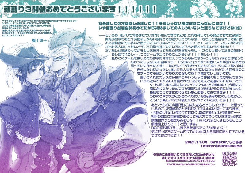 darasinaime☆quiet followINFOこれは悪乗りで作ったグラデ便せんカラーのペーパー!!!!!!!!!#ネットプリント に登録しました。予約番号PKGGDF3A、A4 カラー:60円、2021/11/20迄 #頭割り3 headSplit3 #FF14 #ロスエレ losEles #ロスガル rosgar #エレゼン Tap to full screen (size:4093x2894).Repost is prohibited Let's send reactions! freqpopularsnackothersPayment processing Replies from the creator Follow creator you care about!☆quiet follow darasinaimeSPOILER 3 darasinaimeDOODLE緊縛エレゼンをください オスラもください darasinaimeDONEいつぞやのエアスケブ 4 darasinaimeMENU頭割り3お品書き(ピクスク上にあるものと同一です) darasinaimeINFOこれは悪乗りで作ったグラデ便せんカラーのペーパー!!!!!!!!!#ネットプリント に登録しました。予約番号PKGGDF3A、A4 カラー:60円、2021/11/20迄 darasinaimeINFOたのむ~~~~~~!!フレの小説読んでマ~~~ン!!!!!!https://www.pixiv.net/novel/show.php?id=16414816セブンイレブンのネットプリントにこちらのイラストのポストカードサイズのものをアップロードしております。予約番号A4RLRPKX、はがき カラー:60円、2021/11/20迄。 related works べる(落書きの姿)DOODLE創作相手のおじってくん すずお@眼鏡はおやつに入りますかDOODLEららふぇる RuthPASTうちよそ フレンドお借りした 5 める♔UltimaDOODLEちょっと前に描いたモシャ装備のきおさん 2 はくさいDOODLEきょうもがんばったね! kgc030DOODLE #FF14 はくさいDOODLE寝ろーー!ーーーーーーーー!! RuthPAST依頼絵 フレンド氏 RuthDOODLE暁月幻 18 recommended works さんごさんDONEヨツユ さかなDOODLEクリスマスだし奮発して買ってしまった はちDONE【FF14】巫女ちゃんず! 南野ろんPASTフレオスッテ このみDONE4月20日は相方さんとのエタバン1周年記念でした(n*´ω`*n)1年あっという間でした…今後も幸せなエオルゼアライフを相方さんと紡いでいきます✨ axi1205DOODLEモモラ・モラはただあなたと旅がしたいだけなのだ。ミニオンの説明文を読んで。 2 shuon_komeDOODLE自キャラと他の子借りた チコ@お絵かき帳DOODLE朝のお絵かき。うちの子 アリーセDONEヒュトロ