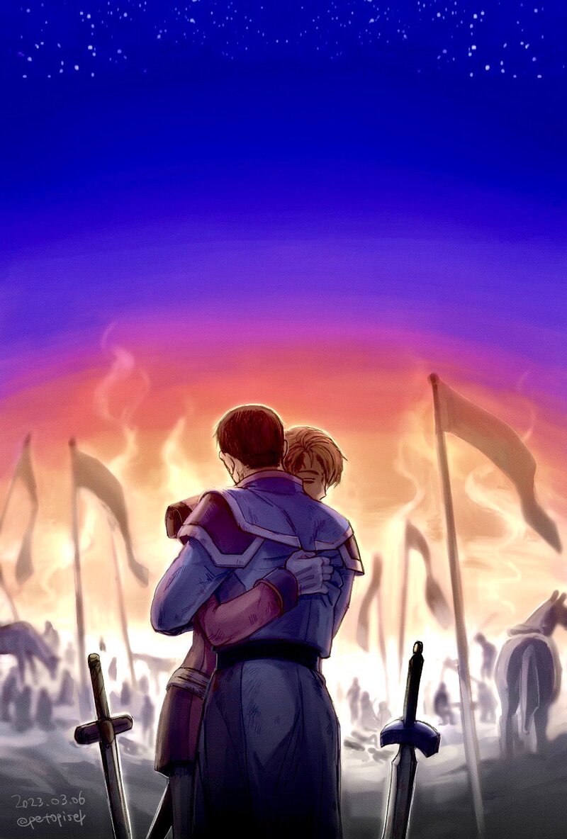 …を描こうとしてたけど、カミューはもしかしたらこの直後笑顔で事切れているかもしれないし隻腕になってるかもしれない(見えない構図だからご想像にお任せするスタイル)と思ったらお祝いも何もあったもんじゃない雰囲気になったので最後まであげるか悩んだ……