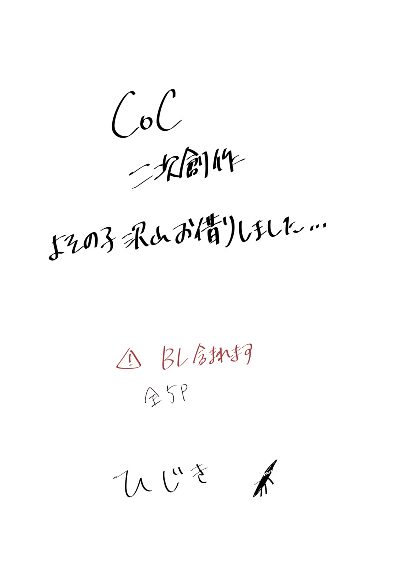 ひじき☆quiet followMEMO裏部誌 show all(+4 images) Tap to full screen (size:2508x3541).Repost is prohibited Let's send reactions! freqpopularsnackothersPayment processing Replies from the creator Follow creator you care about!☆quiet follow ひじきDOODLE🪰陣芋虫 KPC立ち絵差分芋虫原稿未通過❌ 27 ひじきDOODLE演目「薬厄役」立ち絵 差分 ネタバレなし 23 ひじきDOODLE🐔陣芋虫 KPC立ち絵差分芋虫現行未通過❌ 22 ひじきDOODLE🏧陣芋虫 KPC差分芋虫現行未通過❌ 25 ひじきDOODLE🍑陣芋虫 KPC差分芋虫現行未通過❌ 18 ひじきDOODLEVOID現行未通過❌ recommended works baiqi06521613DOODLE亮懿 三人行时雨+小桃花x旗袍懿只是贴贴 你杠就是你对谁骂我就删 吃一口DOODLE枫恒景⚠️景双性⚠️ 2 橙熟森林🍊DOODLE花园if… uniDOODLE📷️~絶望的に服がださい SUN-BOWDONE巳年イラスト。 mznnknirDONEあいすぽよキャラシ 2 Hiyori_seitenINFOCoCシナリオ「クロノワール・メテオライツ」第一章『運命交差のPerseids』—吸血鬼 × 転生者—KP:晴天PL/PC:HO.1:りんごさん/柘榴HO.2:たねさん/永石 悠月クロメテ第1章を回してきました!可愛いPCさん達…立ち絵合わせも素敵✨次章も頑張ってください!!🔥 Hiyori_seitenINFOCoCシナリオ『確信的イナモラメント』KP/KPC:yochaさん/時田 翔里PL/PC:晴天/月木 圭樹END-B 両生還にてシナリオ終了しました!お疲れ様でした…!!!のばHO.1とHO.2で行ってきました…;;沢山泣いた…翔圭樹頑張った……大好きです…。「何があっても、私は翔里の味方だよ」 sensousakuakINFO1/13チャレ30にて頒布する『露草は陽の光を浴びて煌めく』のサンプルです。R18作品の為当日は年齢確認にご協力お願いいたします。 4