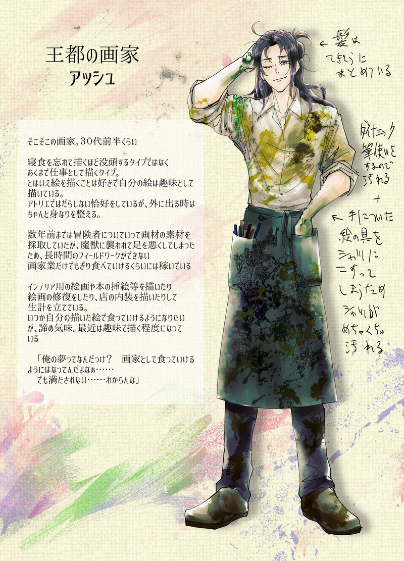 彼の顔料に混ぜるマイカ(=雲母=綺羅)の原石を採取して来て、という依頼をガラルーシャさん、カペラさん、スフェーンで受けたことをきっかけにマイカの旅団を結成することになった、というマイカの旅団の結成時の依頼に関わった人物でもあります。
