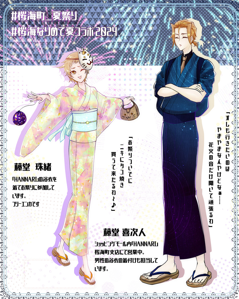 1枚目の喜次人着用の浴衣と3枚目の珠緒着用の浴衣はフォトスタジオMeteore(@ oekakigenmai )様とのコラボ浴衣となっております。