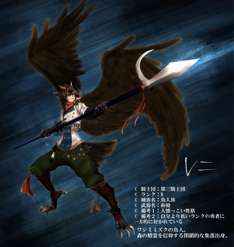 『無明長夜の𝙀𝙨𝙩𝙚𝙡𝙡𝙞𝙘𝙖』【@M_Es_TL】の世界観と診断をお借りしてキャラデザして見ました。ヤンチャ系おのぼりさん鳥人。