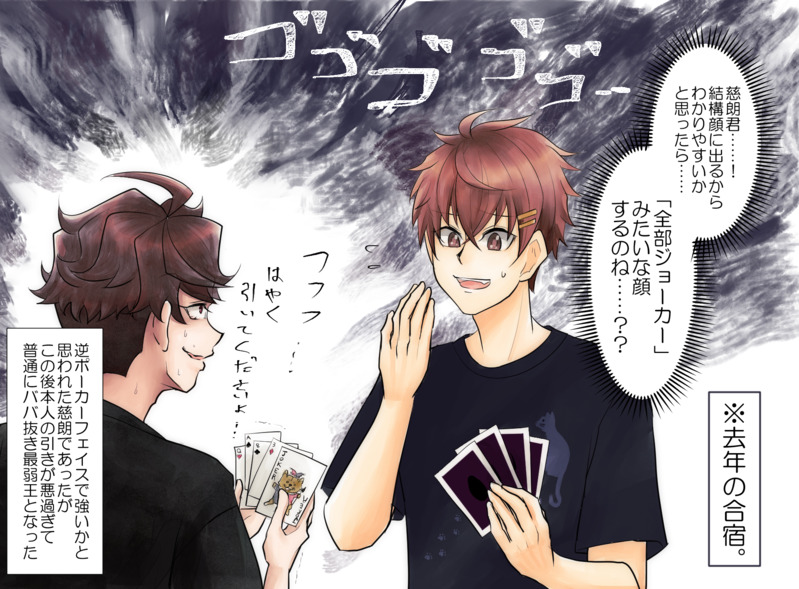 『とき高』の慈朗のツイッターに上げた絵です。1,2枚目よその子お借りしております。一枚目:そーまさんの卯野先輩【@Double_Bind】と。去年の合宿のババ抜き大会の臣で。2枚目:わをあおゐさんの羽島君【@wa0i_】と。今年の夏休み中の部活の日。