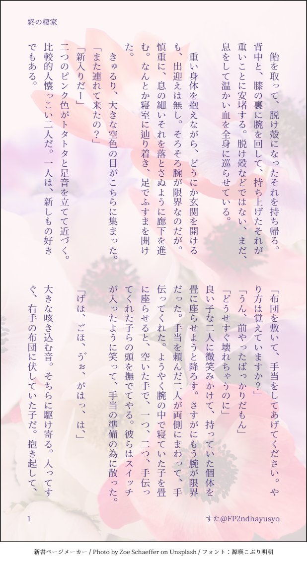 FP2ndhayusyo☆quiet followMOURNING飴を奪ったクローン乱数を持ち帰って、家で看取っている幻太郎の話※暗い※死ネタ※生命倫理に反する行為? #クローン乱数 clonedRandomNumber #夢野幻太郎 fantaroYumeno show all(+5 images) Tap to full screen (size:618x1132).Repost is prohibited Let's send reactions! freqpopularsnackothersPayment processing Replies from the creator Follow creator you care about!☆quiet follow FP2ndhayusyoDONEえださんのクロ🍭を産んだと思っている元クロ乱研究職員の小説の三次創作です。元の小説はこちら✨https://x.com/edanikudk/status/1600484150552989697クロ🍭とこういう関わり方をして、精神を病んで産んだと勘違いするに至ったら良いな、な勝手な解釈・妄想話です。※流血※死ネタ 8 FP2ndhayusyoMAIKING乱数がクローンの学校に通う話その1学校に行く日の朝の話📚と🎲と家族ごっこしてるクローンが自由に社会に出ている世界線 5 FP2ndhayusyoDONEFP3人CPWebオンリー「ポ!Vol.4」の展示品ですパスワードは展示ブースにてクリスマスに🍭に臓器を食べさせようとする🎲と📚、そしてクリパのダラダラ小話 5850字カプ要素はかなり薄いです明言はしていませんが、うっすらカニバ要素があります筆者は🍭と臓器が大好きです 10 FP2ndhayusyoMEMOXに投稿したポ小説をここにまとめようと思います 98 FP2ndhayusyoPROGRESS「Trinity+」展示品 クロらむの島 その2食用動物のお世話係のクロらむの話※カップリング要素ほぼ無し※クロらむが共同生活している島の妄想その2 ※前提として壊れたクロらむを食べる設定がありますが、この話はそういう描写は無いのでR指定はしてません 3808 FP2ndhayusyoPROGRESSヒプ3人以上複数人カップリングオンリー「Trinity+」で掲載予定のクロ🍭×クロ🍭×クロ🍭∞の一部です。※クローン🍭同士の共食い R-18G 描写はぬるい※島に住んでるクロ🍭捏造※倫理観が無く残酷よりの世界観あるクロ🍭に特別な感情を抱いたクロ🍭の話大丈夫ならy〇〇 9 related works soy_ksDOODLE monoDOODLE ♩♩♩DOODLEユメノゲンタロウ ミカエラPROGRESS夢野幻太郎先生が女の子だったら…自然光がよく入る和室の部屋で 執筆してほしい可能なら差し入れしたい 2 きちきちばんばんDONEポッセスーツ らむごろうDOODLEげんたろーっ!!!!!! かもにわDONE 3tubakiDONEマボ syuruka_RepageDOODLE夢野先生〜 recommended works らむごろうPASTらむだ きちきちばんばんDOODLE普通のダイスさんも描く fubuki_kPAST かもにわDONE 夏の枝蛙DOODLE初描き塗りました うにDOODLEポッセ〜〜〜〜〜〜〜! Bari_tomatoDONEDice-Highlow 彩華(SAIKA)MAIKINGうらピース夢野って語感が好き 栗クリームDONE #ヒプノシスマイク#ヒプマイ#有栖川帝統#観音坂独歩