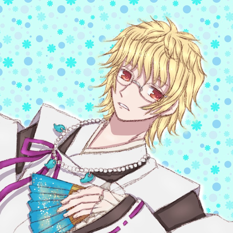 扇子の色は濃い水色にキラキラした模様が入ってるイメージ。基本的に穏やかな好青年キャラなので、その辺りを重視しました。