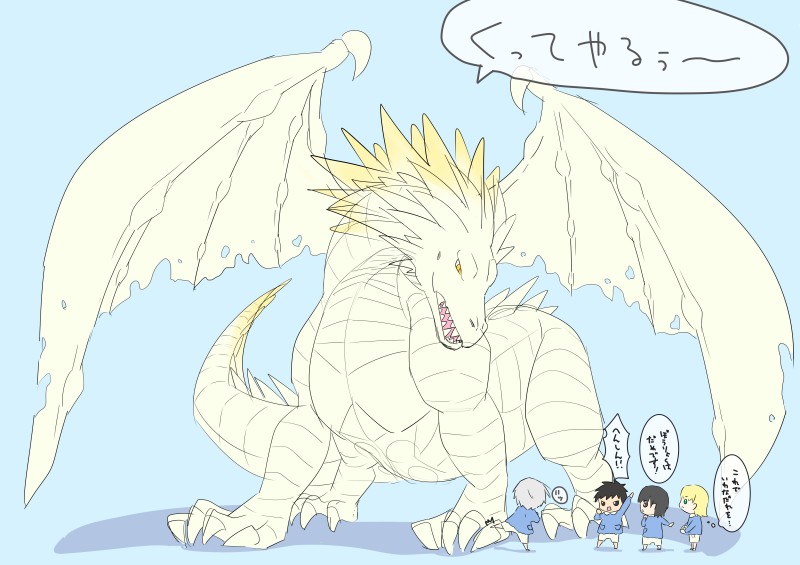 現実逃避で考えてたうちの子たち(ちびっ子のすがた)の前に突然ドラゴンがあらわれたら的な某番組の幼稚園児のコーナーみたいな話を以前描きかけで放置してたヴィクトールしゃん(ドラゴンのすがた)の絵と合体させてとりあえず発散