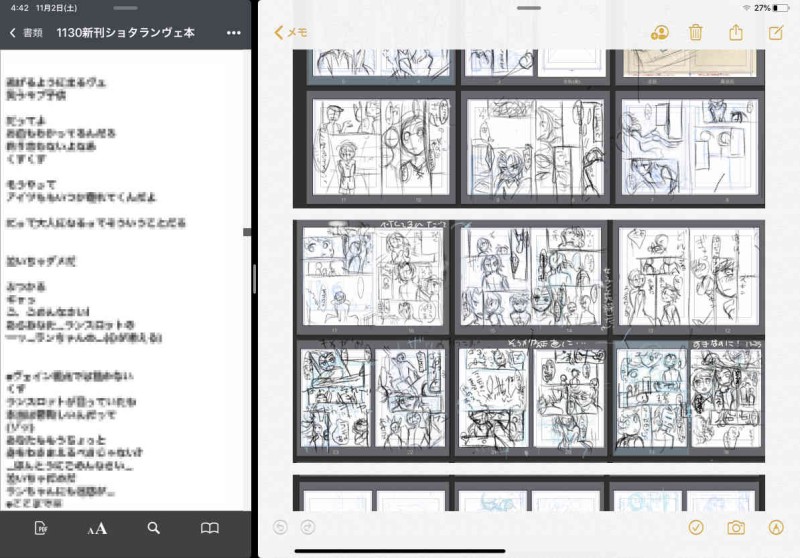 あいぱっよのメモとドキュメントでネーム作業中まだネーム!でもあとラストシーンだけ〜早く作画がしたい
