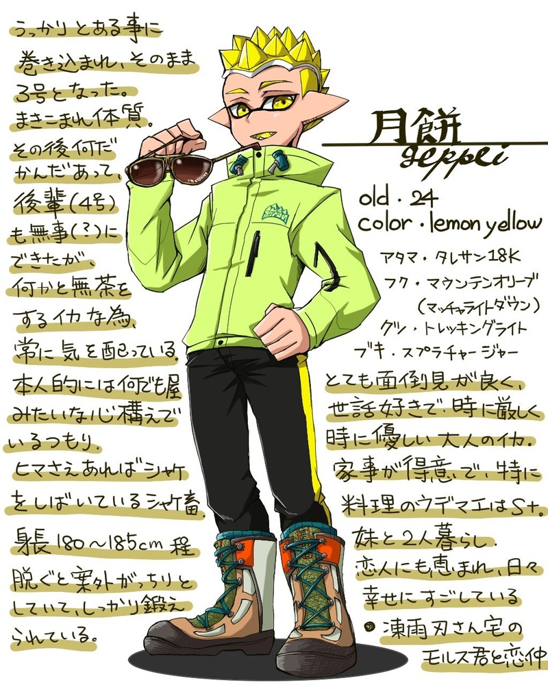 餅ねこ☆quiet followPAST月餅24歳(イカ♂)落ち着いて常に周囲に気を配るタイプ。家事スキルの高い冷静ツッコミ役。下ネタの耐性はあるが、軽く流す。スプラチャージャー(スコープも可)をよく使う #スプラトゥーン2 splatoon2 #マイイカタコ show all(+1 images) Tap to full screen (size:1024x1280).Repost is prohibited Let's send reactions! freqpopularsnackothersPayment processing Replies from the creator Follow creator you care about!☆quiet follow 餅ねこPASTアメ21歳見た目怖いが気のいいイカボーイ場の雰囲気を読むのが上手く、コミュニケーション能力が高い喫煙者のため、幼馴染から禁煙を勧められている(止める気はない)愛用ブキはリッター4K 2 餅ねこPASTシロ19歳表情筋が死んでるイカガールガチマッチにしか行かないのでナワバリなどでフレンドを作ることがないうえに、フレンド申請されても履歴を見ることがないので滅多に応えることはない音楽が大好きだが、親の意向でクラッシックしかやらせてもらえないそのためフラストレーションが溜まりに溜まってる愛用ブキはデュアルスイーパー(デュアルスイーパーカスタム) 2 餅ねこPASTのりたま15歳ムードメーカータイプのイカ付かず離れずの距離感で接してくるので付き合いやすいただ、ふとした瞬間に近寄り難い雰囲気を出す愛用ブキはプライムシューターコラボスプラトゥーン2の時に実装されたバブルランチャーを使うのが好き 2 餅ねこPASTコバルト15歳(24歳)人当たりがよく温厚なイカ(建前)本当はタコワサ将軍より任命されて地上にスパイとしてやってきたタコ利益にならない相手にはめちゃくちゃ冷たい愛用ブキはロングブラスター 2 餅ねこPASTモズ15歳真面目で責任感が強いイカ少々騙されやすい愛用ブキはわかばやもみじ、おちばなどの短射程シューター奇襲や潜伏を得意としてる 2 餅ねこPAST餅子17歳天真爛漫でフレンドが多い生まれつき視力が低く、眼鏡かコンタクト必須愛用ブキはボールドマーカー 2 related works えのき_ポイピクDONEシャケ勢に向けて新年のご挨拶申し上げます今年も元気にシャケ̪シバイていきたいデス(トキシラズ以外でのカンストも目指したいな~)#スプラトゥーン2 #splatoon2 #サーモンラン #SALMONRUN 2 さわらららPASTアズキとマスク#オリイカ #イカップル #スプラトゥーン2 ユキ(yuki002m)DOODLE【スプラトゥーン】らくがき3号ガール さわらららPAST過去にPixivにも載せたキャップくんとボーダーちゃんの出会いの漫画 表紙は一昨年くらいに描いたメリークリスマス絵が縦に....もう..いいや...#Splstoon2 #Splatoon #スプラトゥーン #スプラトゥーン2 #オリイカ #イカ漫画 #イカップル 11 しゃちくDONEゲソを鮮やかに描きたくなって ohu10116DOODLE알몸가 옷를 가슴입니다!? 2 ohu10116DOODLE연어런가 옷을 좋습니다. 열심히 해요. erisajp2002DONE弟の日に描き上げたかった終始背景豆腐なマイイカ姉弟、 3 ぼんでぃTRAINING recommended works からすぱ/KARASPADOODLEマイタコくんらくがき。なかなか前線に出る勇気が出なくて怯えてる。 この前発売されたばっかりのタコボーイamiiboを見ながら描いてたけど難しすぎる…! 2枚目はゲソと目に色塗ったやつ。失敗したわコレ#スプラトゥーン2 #Splatoon2 #マイタコ 2 mmmuPASTフェスの投稿とか きりすけDONE サトちぅDONEうちのチームブラック可愛いでしょ。 まるもちPAST #スプラトゥーン #splatoon #スプラトゥーン2 #splatoon2 🌾耕せ🌾MAIKING そらねず まめDOODLE考え中 ohu10116DOODLE친구가 좋를 입니다! 2 しゃちくTRAINING