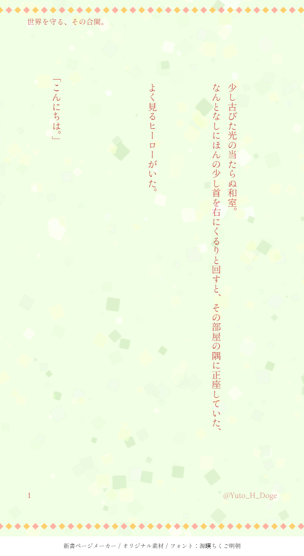ユトニキ☆quiet followDONE初めて書いたドゲ小説。今日実際に見た夢の内容です。ほぼそのまま書いてるので意味不明です。本当に意味不明です。でも感想頂けたら飛んで跳ねて喜びます。自分をダンゴさんに代理でやってもらいました。ダンゴさんごめん。 #フクオカリバー fukuokalibur #ダンゴムシマン pillbug show all(+4 images) Tap to full screen (size:618x1132).Repost is prohibited Let's send reactions! freqpopularsnackothersPayment processing Replies from the creator Follow creator you care about!☆quiet follow ユトニキDONE第2話。前回のゆるふわ闇堕ちの続きです。ちょっと後半薄暗いかなと思ったのでパスワード制にしました。カリバーさんが洗脳される話でぴろんがちょっと可哀想です。フクヤマバディご注意を。パスワード:カリバーさんの誕生日 (1月12日なら「0112」) 37 ユトニキDONEカリバーさんゆるふわ闇堕ち(?)書いてみました。色々と爆発してますのでノークレームノーリターンでお願いします。 7 ユトニキDONE初めて書いたドゲ小説。今日実際に見た夢の内容です。ほぼそのまま書いてるので意味不明です。本当に意味不明です。でも感想頂けたら飛んで跳ねて喜びます。自分をダンゴさんに代理でやってもらいました。ダンゴさんごめん。 5 related works kantenDONE企画参加絵悪の秘密結社社員のダンゴムシマン観察セットこれでどこにでも連れ歩けるよ激務の落ち着いた頃にお菓子食べながら漫画読んでいてほしい一、ニ枚目が最終版で、三枚目は参加時のもの、四五枚目は紹介イラスト完成 12月29日(水) 5 ユトニキDONE初めて書いたドゲ小説。今日実際に見た夢の内容です。ほぼそのまま書いてるので意味不明です。本当に意味不明です。でも感想頂けたら飛んで跳ねて喜びます。自分をダンゴさんに代理でやってもらいました。ダンゴさんごめん。 5