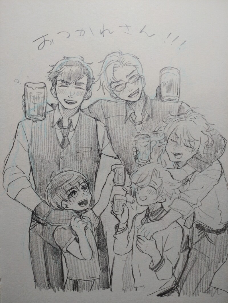 山鳥毛部長が部下の南泉くん連れてパティシエの小豆さんとその息子の謙信くんと山鳥毛部長の親戚で謙信くんとも仲良しの五虎退くんと5人で週末に駅前の居酒屋で合流して飲んでる風景が視える おこさまはジュースで(現パロ)