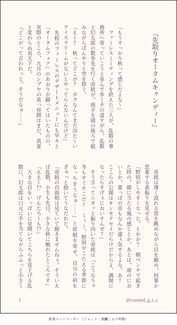 さくとも☆quiet followDONE『先取りオータムキャンディー』小さい秋みつけた feat. ぽっせ栗きんとんを知らない売れっ子デザイナー🍭くん show all(+3 images) Tap to full screen (size:618x1132).Repost is prohibited Let's send reactions! freqpopularsnackothersPayment processing Replies from the creator Follow creator you care about!☆quiet follow さくともDONE帝幻祭9 展示作品『縁側とひざまくら』(帝幻/2493字) 7 さくともDONE帝幻祭9 展示作品『からっぽのとみて星』(帝幻/2872字) 7 さくともINFOありゆめ7サクカですよろしくお願いします さくともDONE『Be my valentine. 』意味:「私の特別な人になってください」ココアで告白する🎲と、お返しに特別をくれる📚。やることやってるふたりの、改めましてのバレンタインデーの話。 8 さくともDONE『鬼の寝床』/帝幻(桃鬼)🍑👹の悪霊退散お祓いえっち🔞※攻め喘ぎ有◇20↑? yes/no 10 さくともDONEお題:「きせき」#帝幻版深夜の創作一本勝負ミラクルフルーツを食べたふたりが、もだもだとイチャついているお話。帝幻ウィンターフェス2とのコラボワンドロ開催おめでとうございます! 4