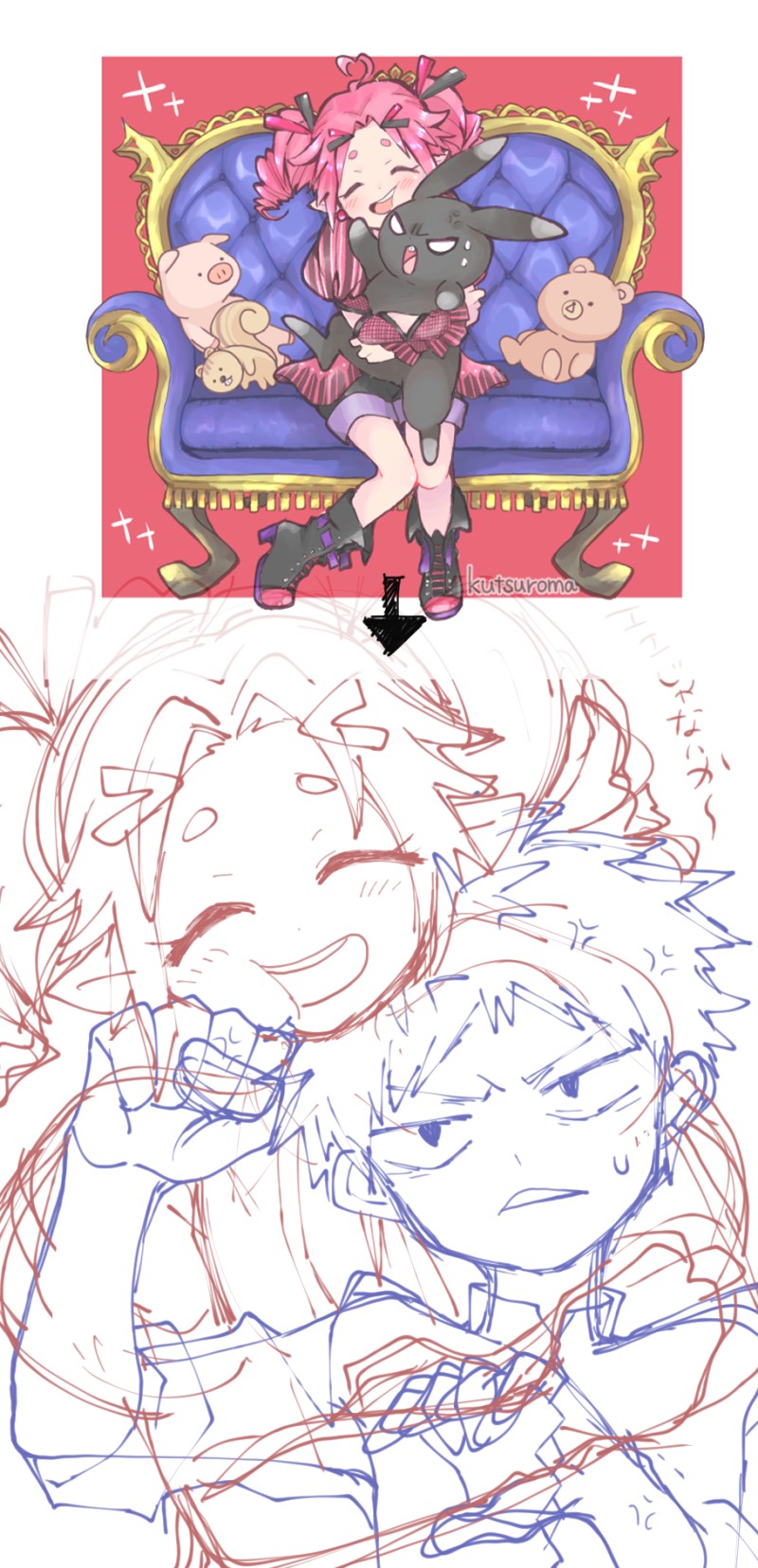 女の子は魔王の娘という設定で描いてまして、黒いウサギのぬいぐるみは魔王によって姿を変えられてしまった勇者だったりします。