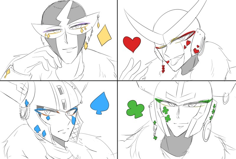 トランプの柄がモチーフで豪華な装飾で…っていう妄想をめっちゃしていたのですがどうしても推し四天王にさせたいので案だけ投げておきます…顔が良すぎて装飾しなくても眩しいよ~~~!!!首元はもふもふのファーでゴージャス感だして王様みたいなマント着せて…って感じです、旗を持たせたりするのもあり…うーん考えるの楽しい!!