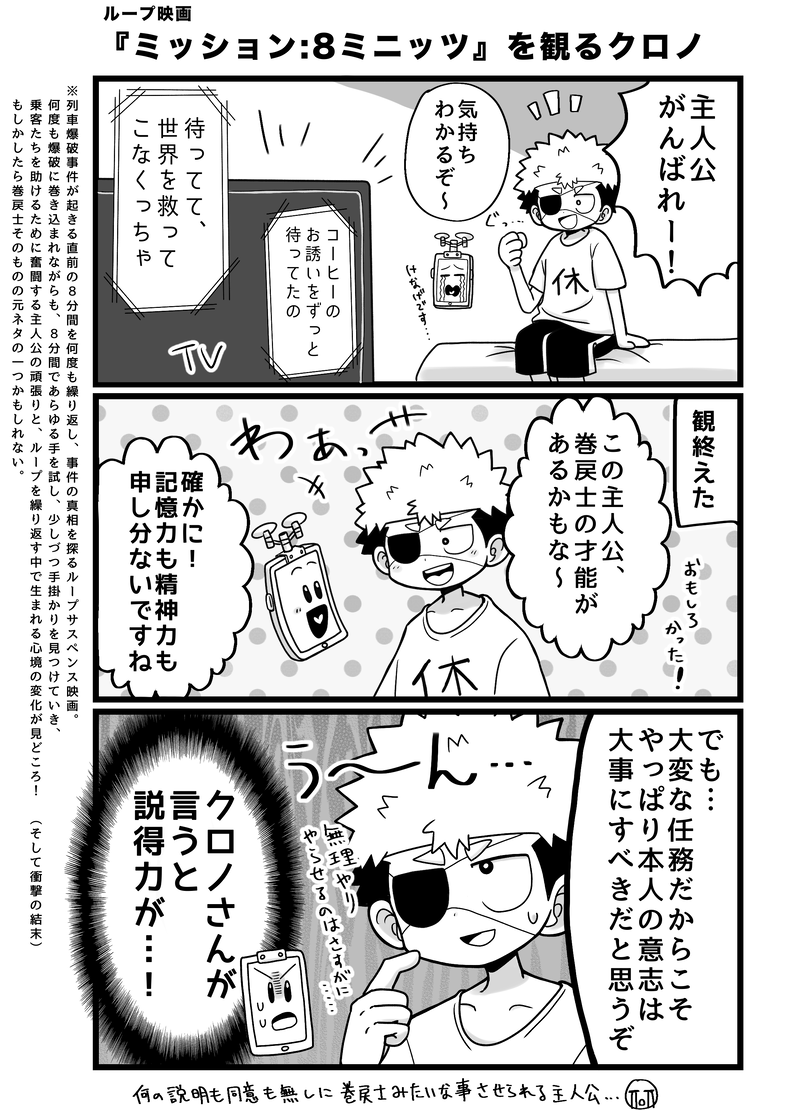 ループ映画『ミッション:8ミニッツ』を観るクロノさん。
