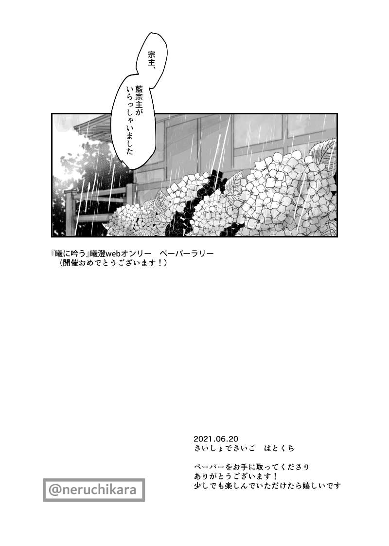 neruchikara☆quiet followPAST曦澄プチオンリーのペーパーラリーでした。プリントしてくださった方ありがとうございました!! show all(+7 images) Tap to full screen .Repost is prohibited Let's send reactions! freqpopularsnackothersPayment processing Replies from the creator Follow creator you care about!☆quiet follow neruchikaraDONE双傑オンリー開催おめでとうございます!!双傑感皆無ですが陳情を渡さなかった江澄と金光瑤のギスギス小話です。 3 neruchikaraDOODLEその微笑みは有毒につき2開催おめでとうございます!イベント合わせの曦澄小話です少しでも楽しんでいただけたら嬉しいです~! 3 neruchikaraPASTその微笑みは有毒につきで参加させていただいた告白をテーマにしたアンソロジーの再録です参加させていただきありがとうございました!! 10 neruchikaraDONE2022.07.03 交流会開催・双傑プチ開催おめでとうございます!!魏嬰のいない13年間を消化するには、変わっていく蓮花塢などなどこねくりまわしたくて、まわしきれなかった小話です。※ベタ等間に合わず、中途半端な状態ですがご容赦ください。 5 neruchikaraDONE曦澄オンリー「その微笑みは有毒につき」のペーパーラリー企画(テーマ:愛情表現)に参加させていただいていたネップリです。プリントして下さった皆さまありがとうございました! 8 neruchikaraTRAINING曦澄のセンシティブ練習らくがきです…※ぬるいですが最中なので成人済みの方のみでお願いします