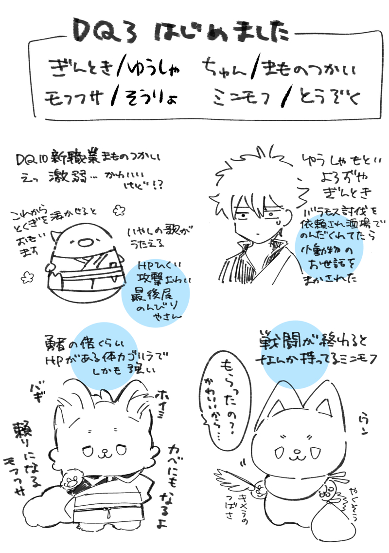【随時更新】DQ3リメイク版、勇者ぎんとき、まものつかいちゅん、盗賊ミニモフ、そうりょモフフサで始めました。「ルイーダの酒場で飲んだくれていた万事屋銀さんがひょんなことから小動物(ちゅんともふズ)を任され、フリーダムな小動物たちを追いかけ保護するついでに冒険し魔王を倒す」という勇者というより保育士な脳内設定です