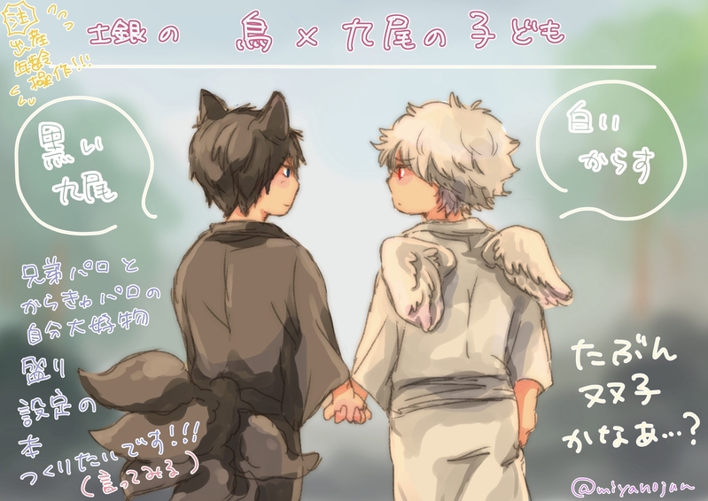 以前発行した烏×九尾のこどもを主役にした土銀双子妖怪パロディ本(「二子魂!」)に関係する絵をまとめました。