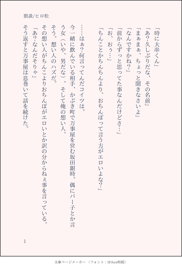 163Girl163☆quiet followDONE #土銀SS猥談この前上げたやつ(♡ˊ艸ˋ) show all(+4 images) Tap to full screen (size:630x928).Repost is prohibited Let's send reactions! freqpopularsnackothersPayment processing Replies from the creator Follow creator you care about!☆quiet follow 163Girl163DONEワンライで書いたものです(♡ˊ艸ˋ)お題:いちごミルク🍓🍼#土銀#土銀SS 4 163Girl163DONE #土銀SS猥談この前上げたやつ(♡ˊ艸ˋ) 5 163Girl163DONE土銀ワンライ♡お題は屋台でした(♡ˊ艸ˋ) 6 163Girl163DOODLE #土銀 #土銀SSひじくん♡ 4 163Girl163DOODLE土方くんが銀ちゃんに手料理を振る舞わないと出られない部屋#土銀 #土銀SS 17 163Girl163DONE #土銀 #土銀SS 11 related works mizuki_pa05MOURNINGRTされたらという診断で『剣と魔法が存在する世界観で付き合ってる二人を第三者視点から』という結果が出て、メモしたのに結果をツイするの忘れたらしきネタを書いて画像化までしてるのに放置してたやつを発掘したので供養。駄文画像化で全8枚。剣と魔法とは?と首を傾げたくなる微妙な世界観の土銀です。普通の土銀でも全然通るじゃんもっと捻れと思いました作文。 8 163Girl163DOODLE土方くんが銀ちゃんに手料理を振る舞わないと出られない部屋#土銀 #土銀SS 17 あすかいDONE土銀でエロ練習ほぼ会話なし 3 163Girl163DONE #土銀 #土銀SS 11 163Girl163DONEワンライで書いたものです(♡ˊ艸ˋ)お題:いちごミルク🍓🍼#土銀#土銀SS 4 miyabiDOODLEいちごみるく 3 163Girl163DONE土銀ワンライ♡お題は屋台でした(♡ˊ艸ˋ) 6 mizuki_pa05PAST絵じゃなくて申し訳ない。みずきの土銀さんには「それは偶然だった」で始まり、「物語はここから始まる」で終わる物語を書いて欲しいです。できれば13ツイート(1820字)以内でお願いします。#書き出しと終わりhttps://shindanmaker.com/801664という診断を元に、きっかり1820文字で終えたやつ。本音言えばもっと文字数乗せてもっとちゃんと書き込みたい← 4 163Girl163DOODLE #土銀 #土銀SSひじくん♡ 4 recommended works ShimuranPAST過去のツイログ(テスト) ひじぎん工房DOODLE upa_srbDOODLE🍶🍶🍶 ひじぎん工房DOODLE ポイピクミッシェルさんDONE月イチ企画第三弾です。「匂い」の相性ってとっても大事らしいです。そんなsgoのお話です。ちょっとえちちなので大人の方限定です。18歳以上ですか? 3600 ひじぎん工房DOODLE子持ち九尾狐 ひじぎん工房DOODLEおつかれ副長を観察してみよう ひじぎん工房DOODLE土銀ワンドロ【通り雨】 ひじぎん工房DOODLE第一訓リメイク銀さんの衝撃