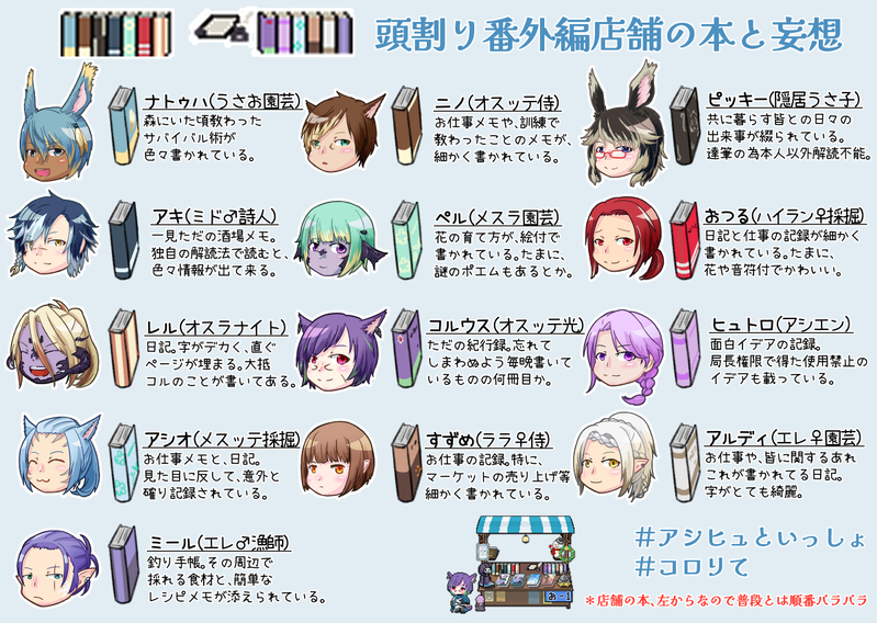 頭割り番外編の店舗小ネタです。店舗にある本、実はうちの子やリテ、ヒュトロの髪色(一部目の色)だったよというやつ。