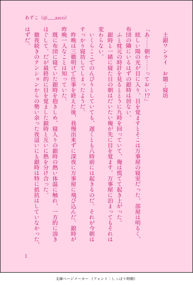 ___asco☆quiet followDONE土銀ワンライログお題:寝坊 #土銀 hijigin show all(+3 images) Tap to full screen (size:630x928).Repost is prohibited Let's send reactions! freqpopularsnackothersPayment processing Replies from the creator Follow creator you care about!☆quiet follow ___ascoDONE土銀ワンライログ お題:花冷え 4 ___ascoDONE土銀ワンライログお題:昔話 4 ___ascoDONE土銀ワンライログお題:寝坊 4 ___ascoDONE愛妻弁当?の話。 4 ___ascoDONE土銀ワンライお題:お汁粉缶のおしるこ思い出して◎ 4 ___ascoDONE2018書き納め。良いお年を〜! 4 related works mizuki_pa05PAST絵じゃなくて申し訳ない。みずきの土銀さんには「それは偶然だった」で始まり、「物語はここから始まる」で終わる物語を書いて欲しいです。できれば13ツイート(1820字)以内でお願いします。#書き出しと終わりhttps://shindanmaker.com/801664という診断を元に、きっかり1820文字で終えたやつ。本音言えばもっと文字数乗せてもっとちゃんと書き込みたい← 4 ___ascoDONE愛妻弁当?の話。 4 sakatsukikyouPROGRESS後篇の表紙。色どんなのにするか迷うー。 nariamori19PROGRESSインテ原稿人物ペン入れ終わり! 6 なつみかんPASTモリガンぎんちょき実は夢魔の銀さんが一週間毎位の頻度で男にその人好みのえっちい夢見せて、その精(精子ではない)を食べてるって妄想だった。なんで肉体的には処女、夢の内容も銀さんは知らない。最近は土方君の精がお口に合ってたので夜な夜な通ってたんだけど、土方君が見てた夢が銀さんとのエロエロだったの知らなくてついに起きてた土方君に下のお口から直接お食事させられるって言う長い説明。 2 akym_07PAST魘魅に蝕まれた銀時の最後の逢瀬 2 gacha5511DOODLE酔っ払い。 sakatsukikyouMOURNING続き描けたらいつか描く。 4 nariamori19PROGRESSインテ原稿まとめ 10 recommended works gacha5511MAIKINGイチャイチャする土銀が描きたくて…😇(訳:デフォルメ絵の練習がしたかった gacha5511DOODLE入れ替わり編見ていてどうしても描きたくて。53巻の表紙は何度見ても顔が良い。 中宮 姫子DOODLEカノンちゃんにリク頂いたテガミバチパロの双子とか天気銀時とか聖母銀時とかにぃにとかクソうぜぇ土方とか。古いのもあるよ。 15 えと(ovo)DOODLE我慢できずにひん剥こうとして、抵抗されてやっと告白して結ばれる学生土銀。 irie_qDONEおどるさん(@oysm284)リクエストのワードパレット、大変遅くなりました🙏昨夜言ってた立ち尽くすふたりですおどるさんリクありがとうございました😊5 純潔下心誘ってる都合良く解釈ごめん 1191 ひじぎん工房DOODLE現パロ土銀 ひじぎん工房DOODLE「ティアキン有給」というネットニュースを見かけたので。 ひじぎん工房DOODLEワンドロ夏季限定 pai510miTRAININGちょっと時間経ったけど新発売のつばきき真選組カラーだと思って。タオルに万事屋って入ってて土方さんが万事屋お泊まりで一応土銀です。またしても逆向きで仕上げてXに投稿してました。のでここでは元々の構図で載せます。