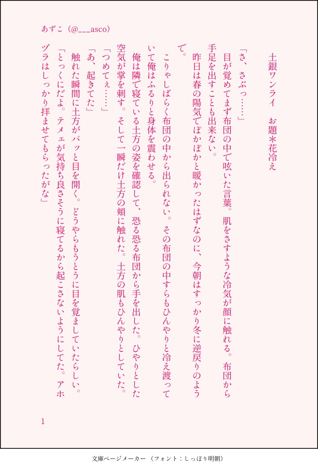___asco☆quiet followDONE土銀ワンライログ お題:花冷え #土銀 hijigin show all(+3 images) Tap to full screen (size:630x928).Repost is prohibited Let's send reactions! freqpopularsnackothersPayment processing Replies from the creator Follow creator you care about!☆quiet follow ___ascoDONE土銀ワンライログ お題:花冷え 4 ___ascoDONE土銀ワンライログお題:昔話 4 ___ascoDONE土銀ワンライログお題:寝坊 4 ___ascoDONE愛妻弁当?の話。 4 ___ascoDONE土銀ワンライお題:お汁粉缶のおしるこ思い出して◎ 4 ___ascoDONE2018書き納め。良いお年を〜! 4 related works sakatsukikyouPROGRESS後篇の表紙。色どんなのにするか迷うー。 akym_07PAST魘魅に蝕まれた銀時の最後の逢瀬 2 nariamori19PROGRESSインテ原稿人物ペン入れ終わり! 6 mizuki_pa05PAST絵じゃなくて申し訳ない。みずきの土銀さんには「それは偶然だった」で始まり、「物語はここから始まる」で終わる物語を書いて欲しいです。できれば13ツイート(1820字)以内でお願いします。#書き出しと終わりhttps://shindanmaker.com/801664という診断を元に、きっかり1820文字で終えたやつ。本音言えばもっと文字数乗せてもっとちゃんと書き込みたい← 4 nariamori19PROGRESSインテ原稿まとめ 10 sakatsukikyouMOURNING続き描けたらいつか描く。 4 ___ascoDONE愛妻弁当?の話。 4 gacha5511DOODLE酔っ払い。 なつみかんPASTモリガンぎんちょき実は夢魔の銀さんが一週間毎位の頻度で男にその人好みのえっちい夢見せて、その精(精子ではない)を食べてるって妄想だった。なんで肉体的には処女、夢の内容も銀さんは知らない。最近は土方君の精がお口に合ってたので夜な夜な通ってたんだけど、土方君が見てた夢が銀さんとのエロエロだったの知らなくてついに起きてた土方君に下のお口から直接お食事させられるって言う長い説明。 2 recommended works ShimuranPAST(2P)自分の気持ちに気づくふたり 2 mizuki_pa05PASTやっぱり絵じゃなくてすみません。フォルダに入ってた土銀ワンドロに参加させていただいたやつを一纏めに。短編の習作のような代物ばかりですが。 12 miyabiDOODLE手乗り銀ちゃんとチョコレート+おまけ 12 Hinat_oiDOODLEタグの 2 naonDONEできたぁ〜〜 水季 M05050206TRAINING【土銀】スイッチ入るとぐいぐいくる土方さんなど良い…本気で抵抗すればぶっ飛ばせるのになんだかんだほだされる銀さんも良い… @gntmyoiTRAININGグリザイユ練習だったんだけど、もっと塗りやすい絵でやればよかった😅構図は気に入ってる😃iPhoneで見るとすごく青くなっちゃった。iPadではもう少し黄色っぽいです。うーん😗 ひじぎん工房DOODLE単ページのらくがき漫画 9 @gntmyoiDOODLEすっかり出来上がってる土銀で、腰くねらせる銀時が「いい?なあ?」と聞いたり、最後は土方さんが上になって貪ったりするのがみたいなあ。パスワード18↑?yes or no 2