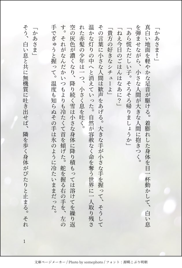 とむた☆quiet followDONEミスラちゃん好きぴと気づいて落ち着かなくなって書いた幼少期ミミ。気に入っている。 show all(+3 images) Tap to full screen (size:630x928).Repost is prohibited Let's send reactions! freqpopularsnackothersPayment processing Replies from the creator Follow creator you care about!☆quiet follow とむたDONEパラロイ本編軸後の愛憎+因縁中心の事件物長編。後日pixiv公開予定。 42583 とむたDONEムルシャイ。いつもの愛憎。 1212 とむたPROGRESS7月18日開催のパラロイオンリーで展示予定の長編です。愛憎中心になる予定だったのがほぼ因縁中心のオールキャラになった。モチベ上げるために序盤アップ。 6433 とむたDONEルチミス。不思議なシュガーのお話。いずれ夢十夜みたいにしたいな(願望) 2852 とむたDONE月が綺麗な夜に急に思いついた愛憎。恋する相手に照らされて、好きなひとと円舞曲を! 2 とむたDONEオズミスって良き良きの良きじゃん?と気づいたときに書いたやつ recommended works mhyk_hymnDOODLE11月22日『猫が騒ぐ日』 ムルシャイまんがです。 5 mhyk_hymnDONE11/22 猫騒新作カイオエ漫画ギリギリになりましたがオエ誕とハロウィン的な漫画描きました! 短くてすみません。おえちゃの舌のアレ描き損なってたんで追加しましたー;;ぴぇ… 7 mhyk_hymnTRAINING下書きしたらペン入れしないで直接色を塗って仕上げてみようという試みをしたムル @あいMAIKING 9 とむたDONEオズミスって良き良きの良きじゃん?と気づいたときに書いたやつ とむたDONE月が綺麗な夜に急に思いついた愛憎。恋する相手に照らされて、好きなひとと円舞曲を! 2 魚類🐟DONEネットプリント登録中(7/25まで)ローソン・ファミマ:F3RHWMQK7Jセブン:1枚目…00734033 2枚目…22136475 2 ただのモブゴリラDONE🌸パラドックスロイド🌸パラロイ専用スレッドです!ぜひ最後まで見てね✨絵文字レスいただけたら嬉しいです♪(更新:2022/05/10) 24 とむたDONEパラロイ本編軸後の愛憎+因縁中心の事件物長編。後日pixiv公開予定。 42583