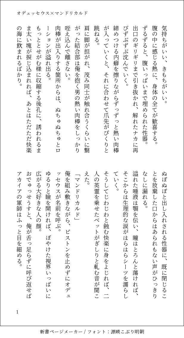 okulave123☆quiet followCAN’T MAKEただえっちしてるオデュッセウス×マンドリカルド。何でも許せる方はお読みください。 #オデュマン oddManOut show all(+5 images) Tap to full screen (size:618x1132).Repost is prohibited Let's send reactions! freqpopularsnackothersPayment processing Replies from the creator Follow creator you care about!☆quiet follow okulave123DONE💀の使い魔になった🦁氏のレオイデ②定期的に情緒不安定になる💀と獣化しても変わらない🦁。①はツリーのリンク参照。しんどい話になっています、何でも許せる方はお読みください。 4 okulave123DONE結局自分で書いてしまった。💀の使い魔になった🦁のレオイデ①しんどい話になってます。何でも許せる方はお読みください。 3 okulave123DONE気持ちがハートになって出てくる両片思いのレオイデの話。 8 okulave123DONEてろっぷさんお誕生日おめでとうございます。ヘクマンとキャスプニがエッチしマンとプニがイチャイチャしてます、受け取ってください 4 okulave123DONE殺ってしまった💀と証拠隠滅する🦁のレオイデ 5 okulave123DONEこれはゴスマリの展開にも屈することなく意地でもくっつけようとするヲタクが書いたレオイデSS※ゴスマリネタバレ注意 9 related works はるのCAN’T MAKEオデュマンでアホエロ 乳 色々許せる人向けR-18なのか怪しいけどとりあえずリス限にします途中っぽいけど力尽きたのでとりあえず上げる 5 okulave123CAN’T MAKEただえっちしてるオデュッセウス×マンドリカルド。何でも許せる方はお読みください。 6 はるのINFOぷらいべったーの絵のログぷらいべったーのリス限絵まとめはこちらhttp://privatter.net/p/5690610蛇姦が混じってるから地雷無い人向け一応マ受けだけで色々なので地雷無い人向け 9 はるのPASTオデュマン過去絵まとめ 3 はるのCAN’T MAKEオデュマン アホエロ ちょっとだけ 攻めのフェラあり 4 recommended works 夏の枝蛙DOODLE 245BstMAIKINGきみに触れるだけで はるのPROGRESS二重線の先へ 本編に載せきれなかったミニ番外編や タイトルの語りです「蒸しパン」 なんでエミヤは蒸しパンを渡したの?「マスターからの返信」 結局マスターの返信は何が来てたの?「タイトルの由来」 二重線?ってどっから来たの?本編を読んでないと1ミリも分からないかもです。きちんと書く時間と元気があれば修正とか追加とか、くっついた後のR-18の話あるかも 4 245BstDOODLEお互い無自覚ヘクマン無自覚に髪いじっていちゃついてるの、可愛いと思います! mourisuikoINFObarトロイア&アウトレイジのヘクトールがショタマと一緒に暮らしている話 ⑥ やっと一段落。⑦が、エピローグですね。メイヴちゃんとオデュッセウスが…敵ボス位置に。読む人選ぶかもしれない。申し訳ないっす。ヘイトではない…。 12 ロビぐだ♂とヘクマンを書きたいDONETwitterで呟いてたヘクマン人魚パロ( https://twitter.com/masakeikotasako/status/1273585771115495424?s=19 )を加筆修正して画像化したものの第六話。今回で呟きの形でTwitter投稿してたぶんに追い付いたかしら。次回、一話から存在をほのめかしつつずーっと出したかった女王様が出ます。誰だか当てられたらその人は凄い。 13 mourisuikoDONE雪を見に行くカルデアヘクマン 4 あき_MOURNING朝からずっと妄想していた新進気鋭俳優レウス君と熱愛報道が出てしまったマ♀とマを狙ってるヘクおじ冒頭部分だけちょろっと書いて満足したので供養します 3 あき_DONE刑事バディパロのヘクマンです続くかどうかは……ちょっと……未定です 15