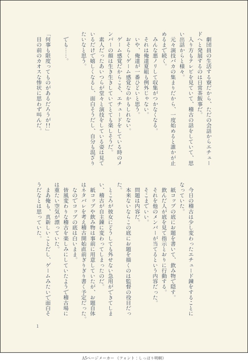 はいびす☆quiet followTIRED昨日もくりで話したみすかず+夏組のギャグ…になったらいいななお話エチュードであそぼ ##みすかず ##夏組 show all(+7 images) Tap to full screen (size:888x1300).Repost is prohibited Let's send reactions! freqpopularsnackothersPayment processing Replies from the creator Follow creator you care about!☆quiet follow はいびすMEMO4周年キーホルダーの行方まとめ*ネタバレ注意 356 はいびすMAIKING海賊に捕まって薬打たれたポールさんを助けに来たと見せかけて、そのまま監禁調教する船長がみたくて書いた。※スカポー 2 はいびすMAIKING心が読めるようになったぴこが、片想いの相手であるすみーの心を読んでもだもだする話(になる予定だった)※すみーはでてきません。最終的にはみすかず 6 はいびすMAIKINGひょすめ(兵皇)裏でメモ書きしてた初めてのキスの話。みすかず要素あり。じゃあするぞと確認すると、十座さんはああと頷いた。 意を決して目を閉じ唇を突き出す。 所謂キス待ち顔ってやつをしてみる。 こういう芝居はいままで何度もしてきたはずなのに、自分の意思でとなると恥ずかしくて、目を閉じてるのもあって徐々に不安になってくる。 待っている感触も降りてこなくて、本当にこれであってるんだろうか……なんて考えていたら、かさついたでも柔らかいものが触れた。 ふいうちだったから、思わず肩が跳ねた。 ただ触れているだけだ。 だけどオレにとっては初めての……。 ああまずい。心臓が痛いくらいバクバク音を立てている。 この音が聞こえたらどうしよう。 ぎゅっと服の裾を握る。 でもキスには段階があって、今してるキスはまだ序の口。『恋人のキスがしたいなら、ヒョードルの唇をテンテンの唇で軽く、はむっとするといいかも! オレがそうするとすみーが恋人のちゅーしてくれるんだよねー』と以前恋人らしいことをしたいと相談した時、一成が得意気に言っていたのを思い出した。 はむっと……してみるか? はむっていうのがよく分からないが……。 相変わらず相手は固まったまま動かない 1104 はいびすMEMO裏で呟いてたネタまとめぴこ派生龍族妄想。炎龍アラジン。魔人はアラジンの周囲にいる炎の精霊と会話ができ、アラジンが龍族の末裔の為、一族で虐げられてきたと把握してる。(枯渇の原因にされてきた)覚醒すれば人として生きていけなくなることも知っており、そうならないように監視してる。…という体で書いていたものの見事に脱線した。ぴこ派生龍族妄想。炎龍アラジン。魔人はアラジンの周囲にいる炎の精霊と会話ができ、アラジンが龍族の末裔の為、一族で虐げられてきたと把握してる。(枯渇の原因にされてきた)覚醒すれば人として生きていけなくなることも知っており、そうならないように監視してる。…という体で書いていたものの見事に脱線した。↓↓↓ 初めて主の肌にソレを見つけたのは、寝食を共にするようになって10日頃だった。 ソレは炎のように赤くしかし薄く硬いもので、光に当てると淡い光を帯びる。 数百年生きてきて話には聞いていたが、実際に手に取ったのは初めてものだった。 本人はソレを持つことに対して自覚がないようだった。 俺もソレを持つ一族が覚醒した後待ち受ける凄惨な末路を知っているから口にはしなかった。 そしてその日から、ソレを見つけた時は見つからないように処置を施してきた。 今日久方ぶりにソレを見つけた。 コレがある……ということは主の身に何か変化があったと言うことだ。 まだ夢の中の主を起こさぬように注意しながら服を捲る。 と、やはり「剥がれ落ちた」のだろう部分が火傷のように爛れていた。「んぅ… 1619 はいびすMOURNINGテキスト版お試し上げDomSubみすかず本でページの都合削った天馬との密会場所。一応こんな設定だった的なやつ。「ここー?」「た、たぶん?」 テンテンからオレ達だけに話があると連絡が来たのはそれから数日後だった。 すみーと2人で来るよう呼び出されたのは高級クラブの入口のような場所だった。 重厚な扉に黒ずくめにサングラスのガードマンらしきひとがいて、とてもじゃないけど近寄れない。 実際何人か追い払われて入店お断りされたのも見た。「やべー……ドレスコードとかいる系じゃんこれ」 テンテンはそれぞれLIMEで送った画像を見せれば大丈夫だって言ってるけど。 せめてそれっぽい服に着替えてから行った方がよくない? なのに待ちきれなかったのかすみーがてこてこ店の方に行ってしまった。「ちょっ! すみー!」「すみませーん」 慌てて追いかけると、ガードマンがオレ達の方を見た。「当店に何か御用でしょうか」 ドスの聞いた声で威圧をかけてくるガードマン。「あ、えっと……」 オレがどう切りだそうかと考えているとすみーが自分のスマホを見せた。「お願いしまーす」 スマホを受け取ったガードマンがスマホに向けて何かをかざした。 ぴーっという音がなり、ガードマンはすみーのスマホを胸の内側にしまった 1427