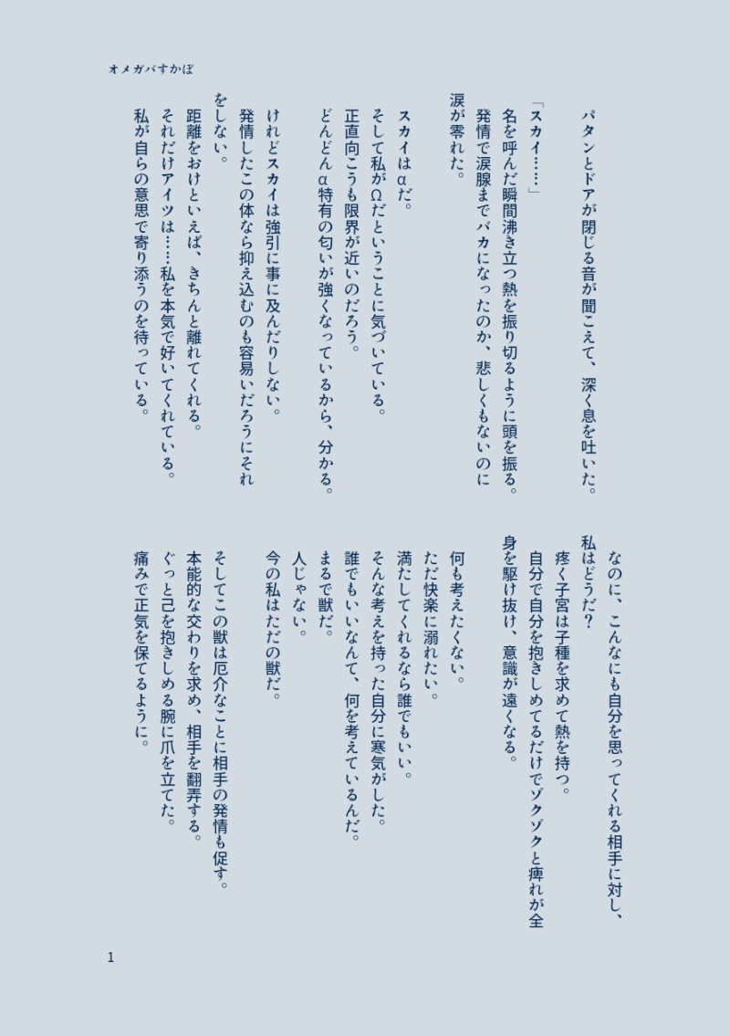 はいびす☆quiet followREHABILIオメガバースなみすかず派生スカポーα船長×Ωポールさんポールさんの矜持の話 ##みすかず ##スカポー show all(+1 images) Tap to full screen (size:888x1260).Repost is prohibited Let's send reactions! freqpopularsnackothersPayment processing Replies from the creator Follow creator you care about!☆quiet follow はいびすMEMO4周年キーホルダーの行方まとめ*ネタバレ注意 356 はいびすMAIKING海賊に捕まって薬打たれたポールさんを助けに来たと見せかけて、そのまま監禁調教する船長がみたくて書いた。※スカポー 2 はいびすMAIKING心が読めるようになったぴこが、片想いの相手であるすみーの心を読んでもだもだする話(になる予定だった)※すみーはでてきません。最終的にはみすかず 6 はいびすMAIKINGひょすめ(兵皇)裏でメモ書きしてた初めてのキスの話。みすかず要素あり。じゃあするぞと確認すると、十座さんはああと頷いた。 意を決して目を閉じ唇を突き出す。 所謂キス待ち顔ってやつをしてみる。 こういう芝居はいままで何度もしてきたはずなのに、自分の意思でとなると恥ずかしくて、目を閉じてるのもあって徐々に不安になってくる。 待っている感触も降りてこなくて、本当にこれであってるんだろうか……なんて考えていたら、かさついたでも柔らかいものが触れた。 ふいうちだったから、思わず肩が跳ねた。 ただ触れているだけだ。 だけどオレにとっては初めての……。 ああまずい。心臓が痛いくらいバクバク音を立てている。 この音が聞こえたらどうしよう。 ぎゅっと服の裾を握る。 でもキスには段階があって、今してるキスはまだ序の口。『恋人のキスがしたいなら、ヒョードルの唇をテンテンの唇で軽く、はむっとするといいかも! オレがそうするとすみーが恋人のちゅーしてくれるんだよねー』と以前恋人らしいことをしたいと相談した時、一成が得意気に言っていたのを思い出した。 はむっと……してみるか? はむっていうのがよく分からないが……。 相変わらず相手は固まったまま動かない 1104 はいびすMEMO裏で呟いてたネタまとめぴこ派生龍族妄想。炎龍アラジン。魔人はアラジンの周囲にいる炎の精霊と会話ができ、アラジンが龍族の末裔の為、一族で虐げられてきたと把握してる。(枯渇の原因にされてきた)覚醒すれば人として生きていけなくなることも知っており、そうならないように監視してる。…という体で書いていたものの見事に脱線した。ぴこ派生龍族妄想。炎龍アラジン。魔人はアラジンの周囲にいる炎の精霊と会話ができ、アラジンが龍族の末裔の為、一族で虐げられてきたと把握してる。(枯渇の原因にされてきた)覚醒すれば人として生きていけなくなることも知っており、そうならないように監視してる。…という体で書いていたものの見事に脱線した。↓↓↓ 初めて主の肌にソレを見つけたのは、寝食を共にするようになって10日頃だった。 ソレは炎のように赤くしかし薄く硬いもので、光に当てると淡い光を帯びる。 数百年生きてきて話には聞いていたが、実際に手に取ったのは初めてものだった。 本人はソレを持つことに対して自覚がないようだった。 俺もソレを持つ一族が覚醒した後待ち受ける凄惨な末路を知っているから口にはしなかった。 そしてその日から、ソレを見つけた時は見つからないように処置を施してきた。 今日久方ぶりにソレを見つけた。 コレがある……ということは主の身に何か変化があったと言うことだ。 まだ夢の中の主を起こさぬように注意しながら服を捲る。 と、やはり「剥がれ落ちた」のだろう部分が火傷のように爛れていた。「んぅ… 1619 はいびすMOURNINGテキスト版お試し上げDomSubみすかず本でページの都合削った天馬との密会場所。一応こんな設定だった的なやつ。「ここー?」「た、たぶん?」 テンテンからオレ達だけに話があると連絡が来たのはそれから数日後だった。 すみーと2人で来るよう呼び出されたのは高級クラブの入口のような場所だった。 重厚な扉に黒ずくめにサングラスのガードマンらしきひとがいて、とてもじゃないけど近寄れない。 実際何人か追い払われて入店お断りされたのも見た。「やべー……ドレスコードとかいる系じゃんこれ」 テンテンはそれぞれLIMEで送った画像を見せれば大丈夫だって言ってるけど。 せめてそれっぽい服に着替えてから行った方がよくない? なのに待ちきれなかったのかすみーがてこてこ店の方に行ってしまった。「ちょっ! すみー!」「すみませーん」 慌てて追いかけると、ガードマンがオレ達の方を見た。「当店に何か御用でしょうか」 ドスの聞いた声で威圧をかけてくるガードマン。「あ、えっと……」 オレがどう切りだそうかと考えているとすみーが自分のスマホを見せた。「お願いしまーす」 スマホを受け取ったガードマンがスマホに向けて何かをかざした。 ぴーっという音がなり、ガードマンはすみーのスマホを胸の内側にしまった 1427