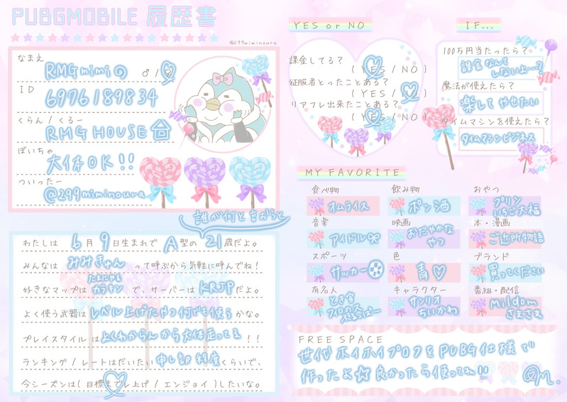 みみきゅん🐧 ྀི☆quiet followDONE懐かしのプロフィール帳風PUBG履歴書作りました。iPad仕様。 #プロフィール帳 profileBook #PUBG履歴書 pubgResume show all(+1 images) Tap to full screen (size:2048x1450).Repost is prohibited Let's send reactions! freqpopularsnackothersPayment processing Replies from the creator Follow creator you care about!☆quiet follow みみきゅん🐧 ྀིDONEゅぃゅぃちゃんを描かせていただきました みみきゅん🐧 ྀིDONEクリスマスツリーのラムラムちゃん みみきゅん🐧 ྀིDOODLE推し達に着て欲しい衣裳案その210年前くらいに流行ったバービードレス💞 2 みみきゅん🐧 ྀིDOODLE推し活アカウントで描いてた推し達に着て欲しい衣裳案 6 みみきゅん🐧 ྀིDONE懐かしのプロフィール帳風PUBG履歴書作りました。iPad仕様。 2 みみきゅん🐧 ྀིDONEたけうちっちさんバースデーカウントダウンした後思いついてバタバタ描いたやつ。あちこちひどいけど推しのブチャラティで。 related works みみきゅん🐧 ྀིDONE懐かしのプロフィール帳風PUBG履歴書作りました。iPad仕様。 2 recommended works casotaso_kDONEEngrave GamingReMさんKENさんIKENUM4さんRaPaNさん 5 月魄ゅぃDONE みみきゅん🐧 ྀིDONEバナナコスチュームざっと描いてしまったので反省点ばかりですがキャッチーな感じに頑張りました! みみきゅん🐧 ྀིPASTぱぶじーやり始めたくらいにアナログで描いてたやつ みみきゅん🐧 ྀིDONE懐かしのプロフィール帳風PUBG履歴書作りました。iPad仕様。 2 nicochin_yokoseDOODLE🐉🐍/桐真路地裏えっちなんぼでも見たいpass 18↑?(y/n) aduma_0711SPOILERこの先の展開のネタバレです。魔法少女たち。 肴飯のポイ箱DONEロマンチストな1人と、そうじゃない1人の話。一度は書いてみたかったネタです。良いホリデーをお過ごしください🎄✨🎁 1471 otku_wtsukiDONEナオちゃん呼びに味を占めたハル