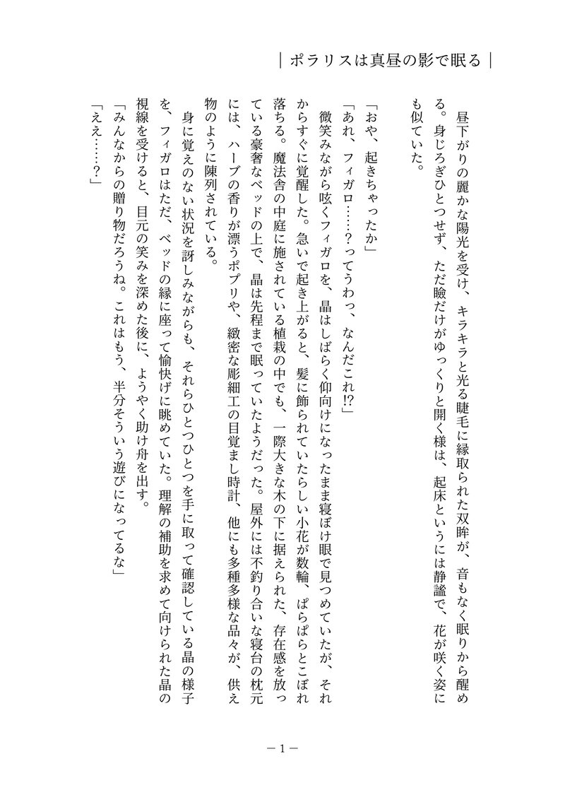 ミモリ☆quiet followDONE『ポラリスは真昼の影で眠る』フィガロと晶が、昼下がりの魔法舎でなにかに気付く話 show all(+13 images) Tap to full screen (size:1748x2480).Repost is prohibited Let's send reactions! freqpopularsnackothersPayment processing Replies from the creator Follow creator you care about!☆quiet follow ミモリDONEワンライ企画で詠んだ、短歌全9首をまとめました。素敵な企画を本当にありがとうございました💐 ミモリDONE光景・Ⅱ“心拍と命の速さは同じらしい そんなに急がなくたっていいよ” 5 ミモリDONE光景・Ⅰ“割れ物を包むみたいに撫でられる きみよりずっと頑丈なのに” 5 ミモリDONE『ポラリスは真昼の影で眠る』フィガロと晶が、昼下がりの魔法舎でなにかに気付く話 14