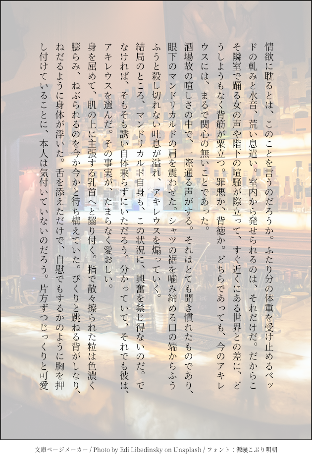 ougishiranami☆quiet followTRAINING某=サンのつぶやきにたぎったものがさらに続きましたいいのかこれあきまんさんです。濃厚なえろがかきたい人生だった。 show all(+3 images) Tap to full screen (size:630x928).Repost is prohibited Let's send reactions! freqpopularsnackothersPayment processing Replies from the creator Follow creator you care about!☆quiet follow ougishiranamiTRAINING某=サンのつぶやきにたぎったものがさらに続きましたいいのかこれあきまんさんです。濃厚なえろがかきたい人生だった。 4 ougishiranamiPROGRESSブックカフェシリーズで、初夜に至るまでの話。おしまいの朝のこと。へくりかさんです。ここまでお読み頂き、ありがとうございました。 4 ougishiranamiTRAININGりはびりがしたいあきりかさん。懲りずに、夏。 5 ougishiranamiPROGRESSブックカフェシリーズで、初夜に至るまでの話。リハビリがてらの六夜目。待っていた。待ち望んでいた。 5 ougishiranamiDONE初出:2020年発行【アシュピオなれそめアンソロ】様指定の期間が経過しましたので、web再録というかたちにて公開させていただきます。主催者様、副主催様、参加者様、お手に取ってくださった方々に、多大なる感謝を。※前半後半で別の話となっております※再録にあたり、当時の原稿サイズから文庫サイズへと再編致しました。段落等多少異なる部分がございますが、内容に変更はございません。 12 ougishiranamiDONE【お空】※いろいろと捏造注意いつものアキリカさんではない、創作ほしのこたちのお話です。 10 recommended works ougishiranamiSPOILERお空のアキリカさんでらぶほオフ会をしてきた記念に。場所が場所なためわんくっしょんですが写真はとてもくいしんぼしてます。もっと詳細なお写真はリカくんのなかのひとのぽいにてどうぞ。一番大事な小箱撮り損ねたガッデム!!!!! 17 はるのSPOILERアキリカさんで先日遊びに行った時のおはなし。マヨネーズ記念日 3 むーんDONE9周年の文字なしと線画背景をぽちぽちぺたぺた塗ってるときも楽しかったです!てきとーだけど笑8周年のピンク!て感じも好きだけど9周年の青系の色味もとても好き 2 MoynaDOODLE ALHgtcDOODLEケチャマス R15っぽい 糸麦くんDONEWk52の漫画「たのしい ゆくとしモフとし」12/26 できた 4 ciadakichiDOODLE2024年10月~12月まとめ 30 らてぃうまDONE健全!!仄暗い!!😈×🈂️(🈂️くんAI)&😈×🈂️(種族反転)の二本立てです。悪魔も恐れるサイコ超人😈概念が大好きです。 4187 みや522PROGRESS歌謡祭楽しかったな……のらくがき群のしたがき