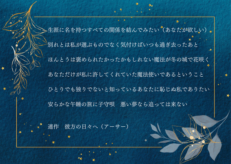 ps1000spring☆quiet followDONEオーロラと夜明けのワルツ4開催おめでとうございます!新作短歌「連作 彼方の日々へ」と、極光祈る犬使いのバラッドの連作を公開します。パスワードはピクリエ内のお品書きを参照下さい。 #アサオズ asaoz #まほやく短歌 show all(+6 images) Tap to full screen (size:1748x1240).Repost is prohibited Let's send reactions! freqpopularsnackothersPayment processing Replies from the creator Follow creator you care about!☆quiet follow ps1000springDONEオーロラと夜明けのワルツ6開催おめでとうございます!追加の作品を展示します。マンスリーお題「夜更かし」をお借りしました。濡れ場のシーンしかありません。未成年の方は閲覧しないでください。 7 ps1000springDONEアサオズワルツ6開催おめでとうございます!当日の展示です。北の城に帰還後、二夜目を迎えた後の朝寝に見た夢の話。ぬるいですが事後の描写があります。 20 ps1000springDONE魔法使いと晶︎︎♀離別Webオンリー「月が綺麗でしたね」開催おめでとうございます!オズ+晶。厄災戦の前夜から、元の世界に帰るまでのつかの間の逢瀬の話。 12 ps1000springDONEオーロラと夜明けのワルツ5おめでとうございます!新作短歌数首を掲載します。 3 ps1000springDONEオーロラと夜明けのワルツ5開催おめでとうございます!新作展示「ささめくものたちの永遠」を掲載します。アーサーとオズに纏わる物の視点を借りた、ふたりの変化と記憶の話です。厄災戦後の未来についての捏造描写があります。 8 ps1000springDONEオーロラと夜明けのワルツ4開催おめでとうございます!新作展示「子ども部屋の情景」を掲載します。アーサーが過ごしたいくつもの部屋の視点から見た、部屋の風景と記憶についてのお話です。2024年アーサーの誕生日のホームボイスネタバレがあります。パスワードはお品書きを参照ください。 7 related works ps1000springDONEオーロラと夜明けのワルツ5おめでとうございます!新作短歌数首を掲載します。 3 tani449DOODLE「賢者の魔法使いより親愛を込めて」予防接種の副反応で39度の熱を出しながら親愛ストーリーを全員分読み返し21人1首ずつつくった短歌 5 ps1000springDONEオーロラと夜明けのワルツ3.5開催おめでとうございます!5月に頒布したアサオズ短歌集「すべてあなたの冬の庭」より未公開分より12首、新作12首を展示します。 6 ps1000springDONEオーロラと夜明けのワルツ4開催おめでとうございます!新作短歌「連作 彼方の日々へ」と、極光祈る犬使いのバラッドの連作を公開します。パスワードはピクリエ内のお品書きを参照下さい。 7 recommended works kzgrmDOODLEフィガオズ写経 kzgrmDOODLE今日のフィガオズ wiz_ard12DOODLEちょと服が脱げてるフィガオズです カブラヤDOODLE1周年にそわそわして描いた 2 zkn_sonoyaDOODLE小アーとでかにょたオz手ブラ上裸注意※※※何でも許せる人向け! zkn_sonoyaDONE1/9 女体化オンリーでの展示作品です。(28p)※明るい話ではないです。※モブ視点から始まる話です。よろしくお願いします。 29 zkn_sonoyaDOODLEアサオズオンリーのお題「表情」お借りしました!入れ替わりネタです。ちょっと読みにくいかも!ミスラとオーエンとカインも出てきます 9 minakenjaojisanDOODLE「First Shot!」と同軸のようなよくわからないエロ小説 5710 minakenjaojisanDOODLE逆トリヤーパン旅行アサオズ(R-18) 4147