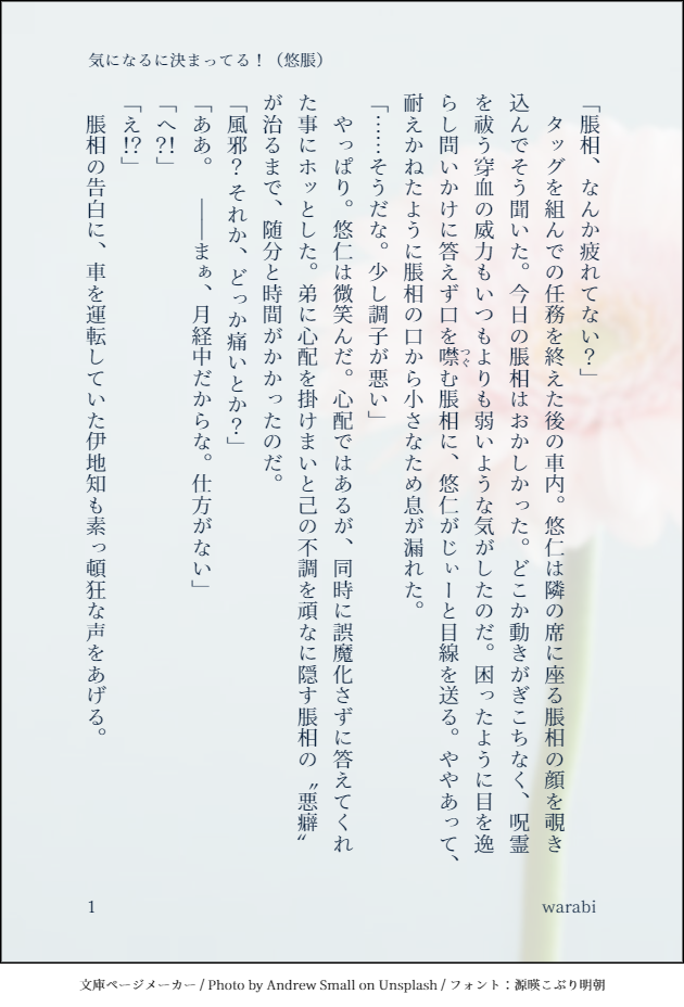 warabi0101☆quiet followDONE気になるに決まってる!(悠脹)※高専預りIF ※脹相が男ふたなり 生理がある脹相のお話です。地雷に配慮していませんのでご注意ください。ノリが軽い。 #悠脹 #男ふたなり manAndWomanWalkingTogether show all(+7 images) Tap to full screen (size:630x928).Repost is prohibited Let's send reactions! freqpopularsnackothersPayment processing Replies from the creator Follow creator you care about!☆quiet follow warabi0101INFO[サンプル・冒頭のみ]webオンリーで全文展示&収録本頒布予定のR-18悠脹小説※脹相高専預りIF ※本誌内容を含みません 3 warabi0101DOODLE※本誌バレTwitterやポイピクに投稿していたものをまとめました。自作の二次創作小説をテーマにしたオマケ的なイラストがあります。後半、男性妊娠やふたりの子供の捏造などあります(ワンクッションあり)。ご注意ください! 36 warabi0101DOODLEいいんでしょうか いいんです(悠脹)※現パロ ※実兄弟設定大学生悠仁君がお盆休みに帰った実家で兄貴とセックスしかしない話。毎日暑いですね。皆様どうか体調にお気を付けください。 8 warabi0101DOODLE※悠脹両方女体化 ※現パロ ※モブ→脹のナンパ南国のビーチでナンパされた悠♀脹♀がナンパ関係なくイチャイチャする話です。第三者が絡むCP好きすぎて二千回書いちゃいます。ごめんねナンパボーイズ。あと、めちゃくちゃハワイ行きたくなった。 4420 warabi0101DONE【同人誌のおまけ】2023年7月発行 悠脹全年齢同人誌『しあわせのよる』のおまけです。掲載した挿絵+α(勘違いして描いちゃったやつ)。パスワード:本の449pに記載しています 29 warabi0101DONE※本誌バレTwitterやポイピクに投稿していたものをまとめました。自作の二次創作小説をテーマにしたオマケ的なイラストがあります。後半、男性妊娠やふたりの子供の捏造などあります(ワンクッションあり)。ご注意ください!今日は兄の日だそうで、記念に。 35 related works S1CKDOODLE※男ふたなり、カントボーイ(乳房が女性のもの)がいますЭксперименты на людях組に実験服を着せてみたかっただけの落書き実験服というよりかは健康診断用の服とも思える。最後だけ乳首見えてますA doodle that just wanted to dress the Эксперименты на людях group in experimental clothing.It seems more like a medical examination suit than a laboratory suit. Only at the end you can see the nipples.Q.実験服is何(What's a lab coat?)A.此処(https://poipiku.com/266804/8815282.html)のニグレドが着ていた服の事(The clothes that Nigredo was wearing.)人物:Эксперименты на людях組 5 S1CKDONE※男ふたなり、カントボーイ、初っ端から血出てる身体を取り換えられ生理も来る受難者人物:桃、ヴァン(VN300-02)、白真 2 NanaSan_18DOODLE18? lavillardiaDOODLEモブ×男ふたなりクラウド amatou0809DONE貧乏性なので無駄に差分作っちゃったケツ毛は流石に自重しました 3 S1CKTRAINING※男ふたなりR20だしちんこ出てるし男の身体におっぱいがついてますパスワードは桃の英語頭文字(大文字) 5 S1CKDONE※R20、男ふたなり・ボテ腹有桃がひたすら滅茶苦茶に犯されるだけの奴(過去作) 2 S1CKTRAINING男ふたなりとボテ腹が好きだっていうそれ※R20 S1CKDONETwitterlog+α(ラスト2枚肌色多め) 19 recommended works teamiDOODLE悠脹*“お兄ちゃん” 2 阿枫茶啊DOODLEstyle 5 アリナシゴレン🍝DOODLEカントボーイお兄ちゃん、本当のらくがきです、すんません18歳以上ですか?y/n 2 たたみDOODLE悠脹🔞 ふぇ… 4 mo_onaa_DONEレオ司webオンリー開催おめでとうございます🎉passは会場内のお品書きに記載しております。webオンリー展示イラスト1恋すくレオ司 dgmrpunchDONE渋谷事変後、生理現象でムラムラはしても罪悪感とか失ったものを思い出してなかなか射精がうまくいかないゆうじと射精サポートするえちおね兄(無自覚)と言うよくわからない設定パス(18? y/n) TF052PASTCCでの🔞無配です。悠脹18↑? 4 阝可氵普DOODLE捏造注意⚠️⚠️⚠️狩人虎x澀谷脹 2 みーちゃんDOODLE使い方勉強中です 11