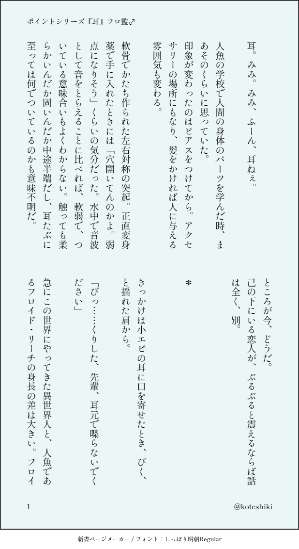 koteshiki☆quiet followDONEポイントに絞って書くシリーズ『耳』フロ監♂※後半若干の性描写あり ※諸々捏造言葉攻めまでやりたかったのに私に実力が足りなかった……(orzのポーズで) show all(+6 images) Tap to full screen (size:618x1132).Repost is prohibited Let's send reactions! freqpopularsnackothersPayment processing Replies from the creator Follow creator you care about!☆quiet follow koteshikiDONEThanksgiving for you. 平日ピクニック!(男監督生受け平日イベント)トレ監♂SS展示①「『普通』のキスマーク」※直接的な描写がないのでR18としていませんが、性行為に関するパートがあります。ご注意ください。※ヴィル、ケイトが登場します。トレ監♂におけるトレイ先輩ってどういうヴィランなんだろう…としみじみ考えたらこうなりました。 8 koteshikiDONEThanksgiving for you. 平日ピクニック!(男監督生受け平日イベント)トレ監♂SS展示②「今日という日に感謝を!」トレイ先輩2022バースデーネタ、Twitterで公開済み。 5 koteshikiDONEポイントに絞って書くシリーズ『耳』フロ監♂※後半若干の性描写あり ※諸々捏造言葉攻めまでやりたかったのに私に実力が足りなかった……(orzのポーズで) 7 koteshikiDONE③2/18ロロ監♂webオンリー展示Twitter再掲 公開済みのためパスワードなし※ユウ呼び、一部グロマス内の台詞あり※①~②とは全く別の世界線です。真面目。 5 koteshikiDONE②2/18ロロ監♂webオンリー展示※ぬるいですが性描写あるためワンクッション※ユウ呼び、①ストックホルムシンドロームの続き※激短い、本番無し 3 koteshikiDONE①2/18ロロ監♂webオンリー展示※ユウ呼び、元の世界へ帰る話あり※ユウくんがロロ・フランムの心の氷を溶かしていること前提※ギャグです。ロロ→→→→(←)監♂ まともなロロくんではない※「んふふ」「ロアなんとやら」の時点で彼は面白いところもあると思うんです(自己解釈) 4 recommended works ぽめ🌞💎DONE音也のことMだと思ってるけどたまにSになるのがいい kuzuyaro_nekoDOODLEftnr扉︎︎ ♀×柱のらくがき※女体化 3 チヂミ飴DOODLE(DSエラーくんできゅうくらりんできちゃう) Sx2kl4everDOODLE⚠️バニー服、女装⚠️💜💙フォロワーさんの素敵なお話を少しお借りしました、問題があれば削除いたします🙇♀️ 鈴木ぜしらMOURNING灼炯の漫画のネームが10Pほど出てきたので供養多分まだどこにも出してなかったはず結局漫画同人誌は諦めて小説にしたのでした残りはプロット状態をみつけたのでのこしておく 15 akane_orecaDOODLE⚠️壁尻⚠️モブ×ノ\ショ⚠️ノ\°ント"ラが不憫⚠️パスワード(18↑?) mob___2__DOODLEおみくじと同時並行してたアナログあけおめあけましておめでとうございました しとろんDONE2025.1.13Happy Birthday Tori Himemiya桃李ちゃんお誕生日おめでとう🍓 ユキヒロMOURNING+らくがき 3