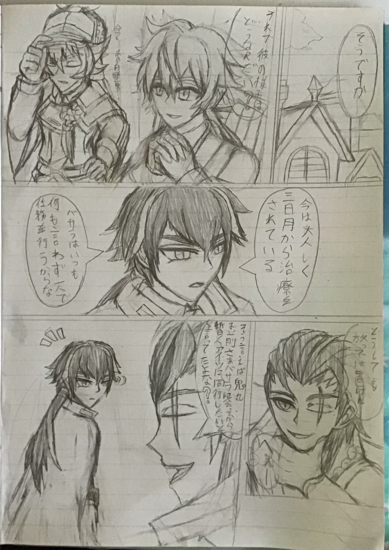 前にTwitterに上げた最後まで描くかどうか分からない「任務中獣神化出来る事を隠していた鬼丸にバサラが突っかかる話」という漫画の1ページの下書き✍️一応保管用にここに上げて置きます😅長くなりそうな漫画は描くのは難しいな…😅