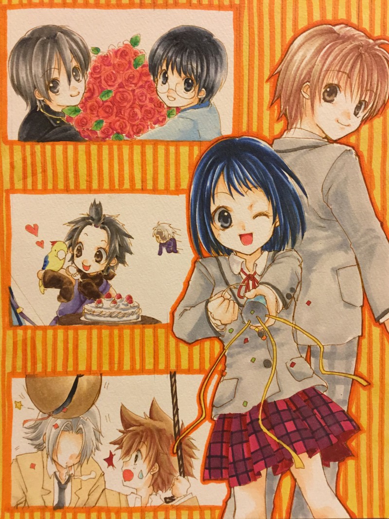1枚目。美亜子さん、恵君、山崎、新八、蘭丸、元親の鳥さん、ツナ、獄寺君。サイトの周年記念絵。お祝いっぽくしました。お気に入りです。