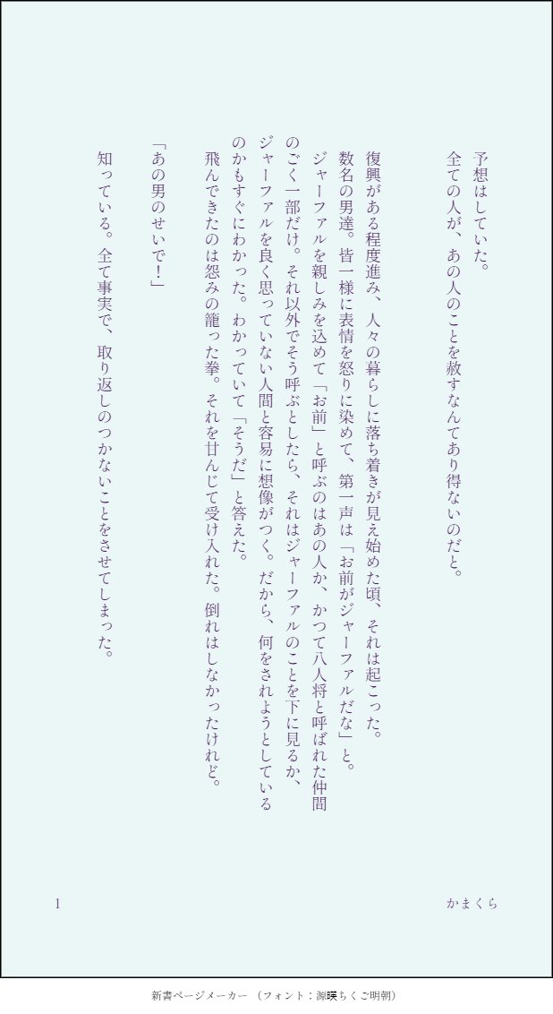 makulakamakula☆quiet followMOURNING帰還シンジャと見せかけたただの性癖看病はいいぞ… show all(+6 images) Tap to full screen (size:618x1132).Repost is prohibited Let's send reactions! freqpopularsnackothersPayment processing Replies from the creator Follow creator you care about!☆quiet follow makulakamakulaDONEディルガイペーパーラリー企画の漫画です。お題は「温度」webオンリーおつかれさまでした! 3 makulakamakulaPROGRESS年内に出したいと考えている、モンドの特産品をテーマにしたディルガイ本の1話目です。 7 makulakamakulaMAIKING帰還後、ジャとの結婚を思いつきさりげなくアピールするシンと、お約束みたいに気付いてくれないジャの話……になったらいいなと思う。当然のようにマスが、その他大勢が巻き込まれるかもしれません。 makulakamakulaDONE葡萄畑で会いましょう2のサークルカット用に描いたイラスト(の線画)です。塗りたいという方は恐れ入りますがピクスク内の「おしながき」をご覧ください。ぬりえが完成しましたらぜひ拝見したいので私宛のリプ等でお知らせいただけたらとても喜びます!! makulakamakulaDONEクリスマスだってのにバレンタインネタ(書きたかったから)勢いで書いたので誤字脱字はご容赦下さい。パスワードについては次の問題の解答(数字のみ)となっております。ガイアくんがラグヴィンド家から家出して毎分80mで歩いて行った。ディルックおにいちゃんがそれに気づき5分後に毎分100mで追いかけた。ディルックおにいちゃんがガイアくんに追いつくのはディルックおにいちゃんが出た何分後か。 8640 makulakamakulaDOODLE recommended works しん☆PROGRESS読切漫画の本格下描き(青)。ラフ(赤)と変えた部分は、主人公の目つきを鋭く少し気が強い感じにした。下のコマの身長バランスの調整・・見比べてみてください・・ 2 みりんさんDONE完成後と完成前 2 夢想曲PROGRESS本日の作業の成果。ショタフェス5に出す新刊の挿絵のラフの一部をちょい見せ。※全体図は18禁絵になります。 夢想曲DOODLE過去にイラコン用に描いたキャラクター。フォロワーさんの中でこの子が好きだと言ってくれた方がいたので折角だかららくがきしました。このポーズが描きたくなったけどこれやるとマントで腕が見えなくなるので色々外して描いちゃいました。 あさねDOODLEショタマレイデ PrzmStarDOODLEおはようございます☀昨夜は絵チャとか色々お付き合いいただきありがとうございました〜\(^o^)/本日も楽しく頑張っていきましょー! 代打に代打DONE原神のウェンティくんを描いてみました only_death_onlyDOODLEU두로만 가도록 열심히 개발 중 しん☆INFOpixivにて「レスラー少年!試合前!」を投稿してますhttps://www.pixiv.net/artworks/95998910オリキャラのプロレスラー少年「TO-YA」の試合前 みなぎる闘志のなかコスチュームの着替えシーンレスラーパンツ ブリーフ チンポ出し!それぞれ3パターンを載せています