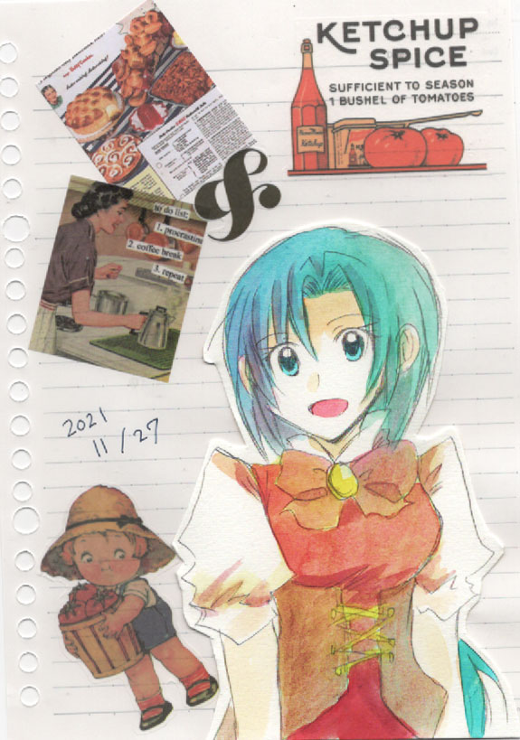 今日の一枚!オリジナルよりレイティ。宿屋(厨房)の看板娘っていう設定から料理な感じに。左下の男の子のシールどうしよう…って思ってたけど使ってみたら違和感無かった(?)