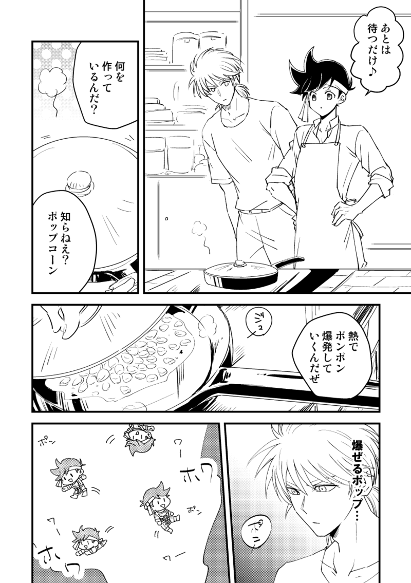 鍋の中でコーンが弾ける音に??ってなった長兄にポップくんがポップコーンの作り方を説明するのですが、うっかり「つかポップコーンのポップって爆ぜるとか弾けるっつう意味じゃなかったっけか?」という感じで余計なことを言ってしまい長兄に忌まわしき記憶(メガンテ回)を思い出させてしまい無言でひしっと抱きつかれる、というほのぼのヒュンポプ
