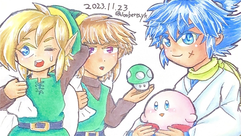 木曜なのでアナログどんべな絵どうやらキノコ王国から秋のキノコ採りから帰ってきたリンクちゃん達と帰ってきたので懐から出てきて出迎えるカービィちゃんとどんべちゃん塗りはやはりコピックです。