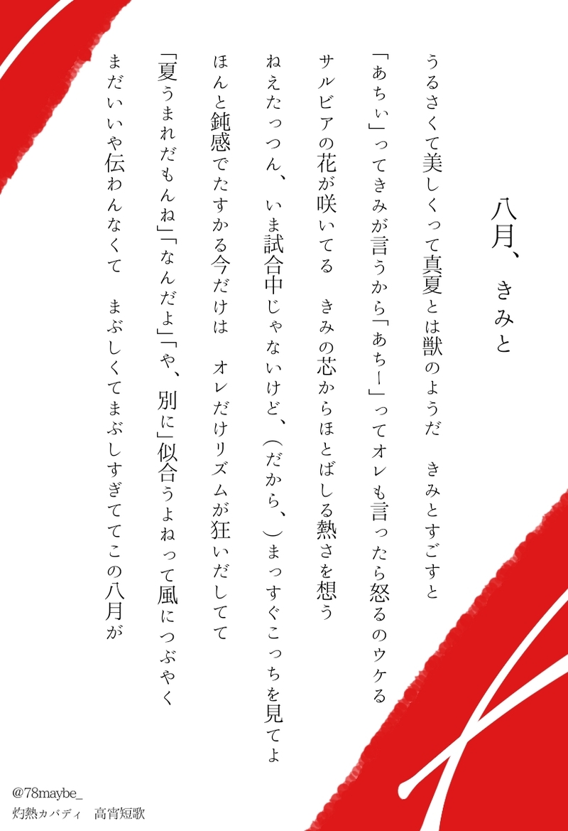 78maybe_☆quiet followDONE🔥🦛 高→宵っぽい短歌の連作できたーッ…疲れた…シチュエーションが不明ですが暑い日に出かける二人です ##灼短歌 Tap to full screen (size:821x1200).Repost is prohibited Let's send reactions! freqpopularsnackothersPayment processing Replies from the creator Follow creator you care about!☆quiet follow 78maybe_DONE再掲宵越をテーマに短歌3首 78maybe_MOURNINGワンドロワンライに間に合わなかったので……🔥🦛 外園をテーマに短歌3首 78maybe_DONE🔥🦛 高→宵っぽい短歌の連作できたーッ…疲れた…シチュエーションが不明ですが暑い日に出かける二人です 78maybe_MAIKING高→宵 っぽい短歌。いっぱいできたら連作にします。進捗が滞っているのでとりあえず1首あげたい。 2